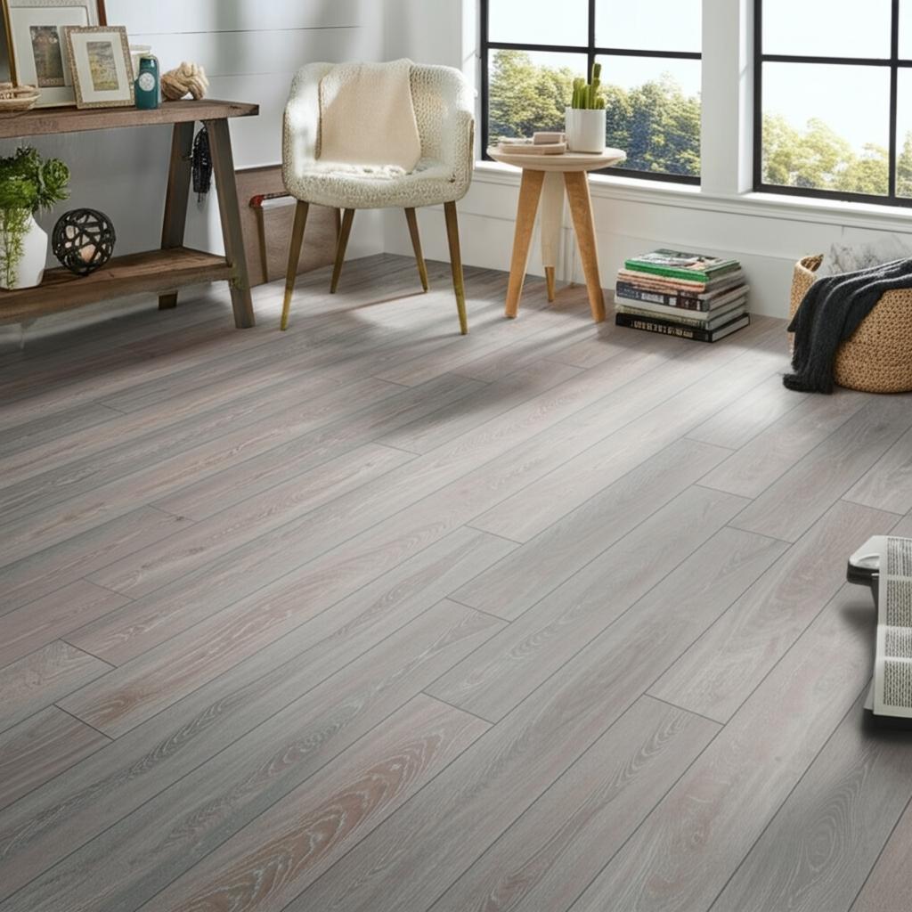 Ackland Oak laminate flooring combines timeless style with advanced functionality. Featuring water resistance for up to 24 hours and a durable AC-4 wear layer, it is perfect for both residential and light commercial spaces. Its light gray wood texture adds a sophisticated touch to any room.