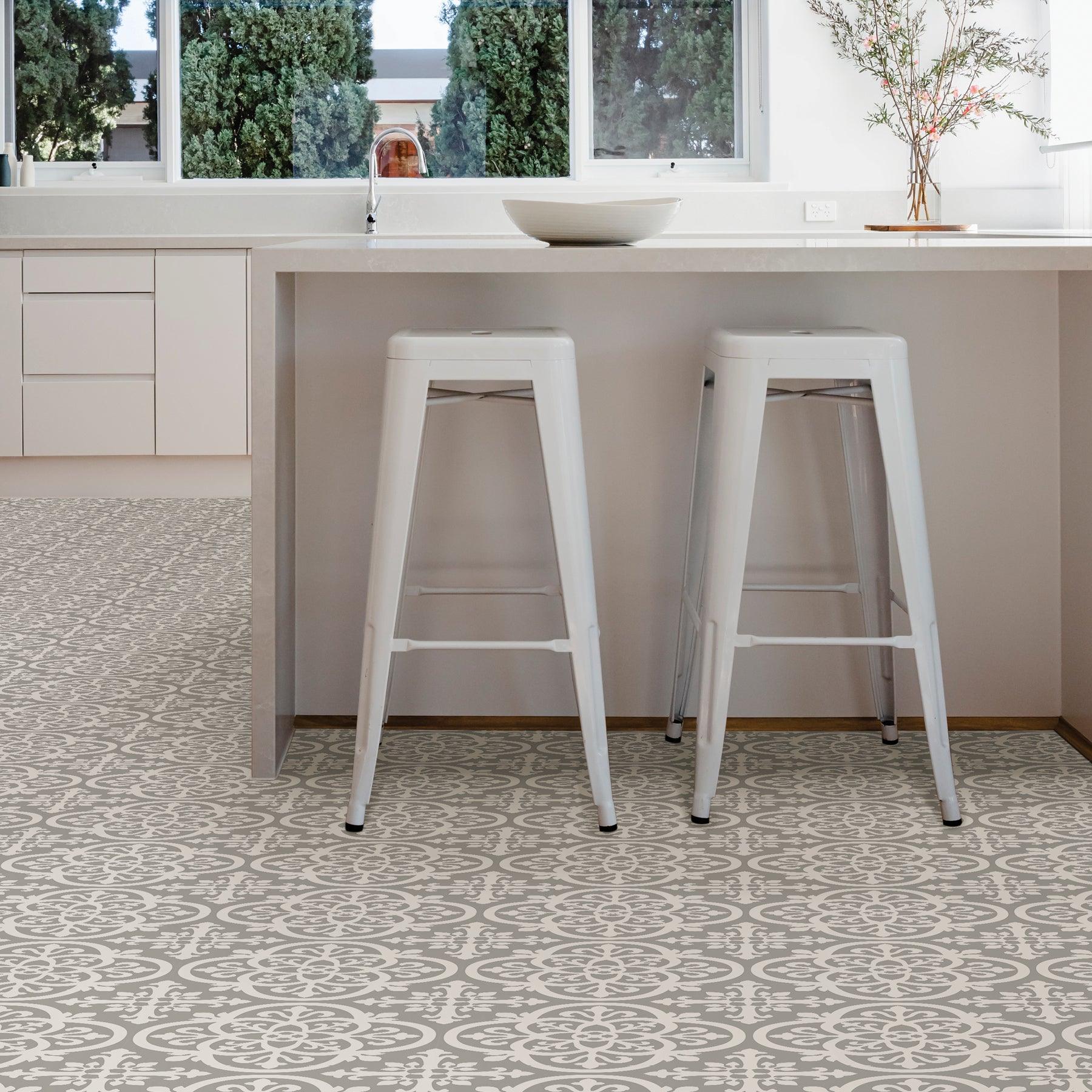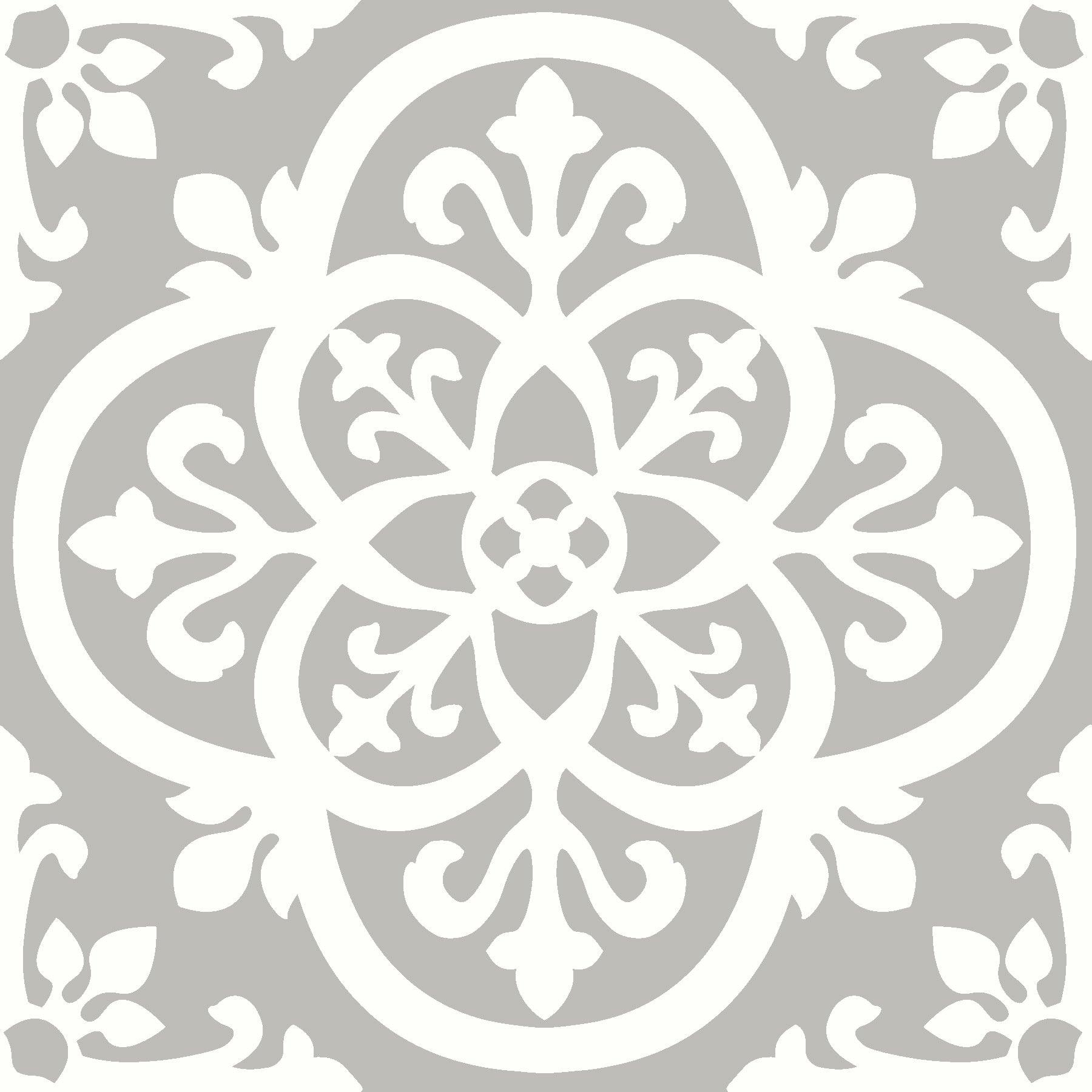 With light grey and white hues, these virgin vinyl floor tiles have a chic farmhouse style. Their intricate ironwork design has a gothic flair. FloorPops Medina Peel & Stick Floor Tiles contain 10 square pieces on 10 sheets that measure 12 x 12 inches. This product measures 60 inches long, 24 inches wide, and 0.06 inches thick when assembled and weighs 5.5 pounds. FloorPops have a textured low lustre finish and one pack covers 10 square feet.
