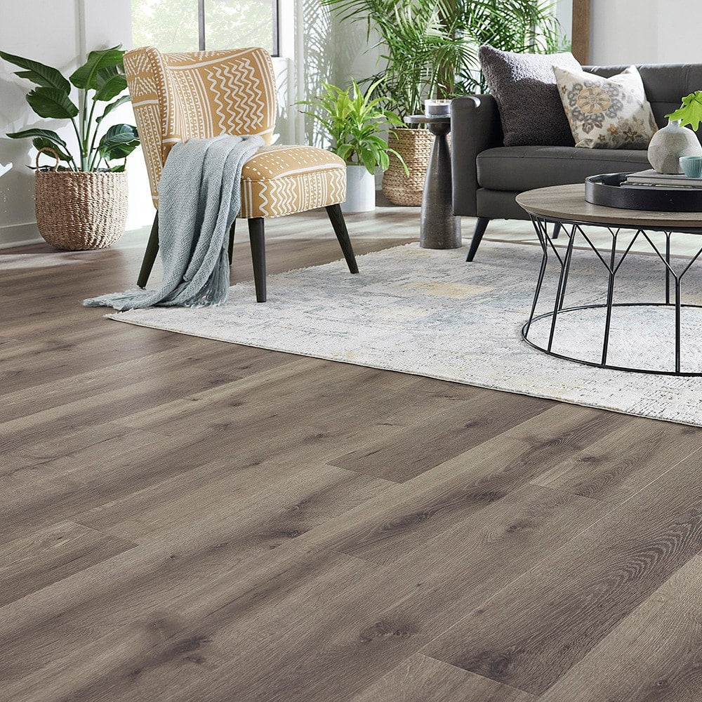The Pergo TimberCraft +WetProtect Ruxin Oak Laminate Flooring brings a touch of timeless elegance to any space it graces. Its rich grey tones and wirebrushed texture meld seamlessly with both modern and classic aesthetics, creating a warm, inviting atmosphere. Style this flooring with lush area rugs and sleek furnishings to enhance its natural beauty. A perfect cornerstone to luxurious living, it offers incomparable durability and enduring charm.