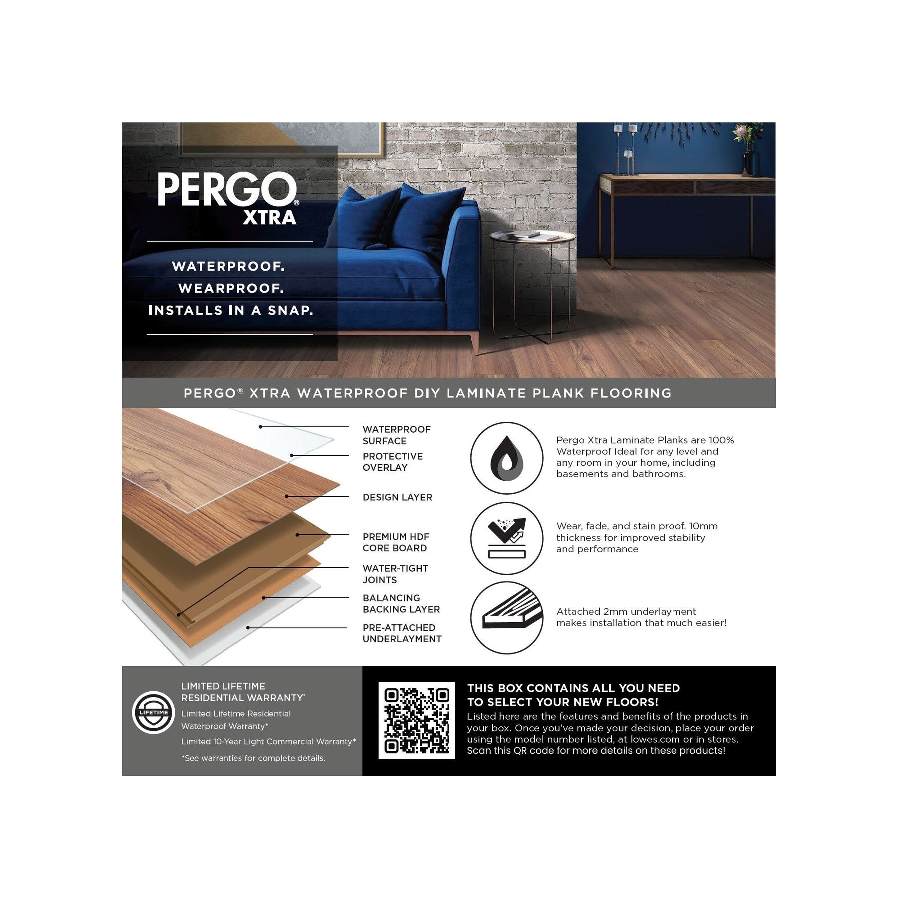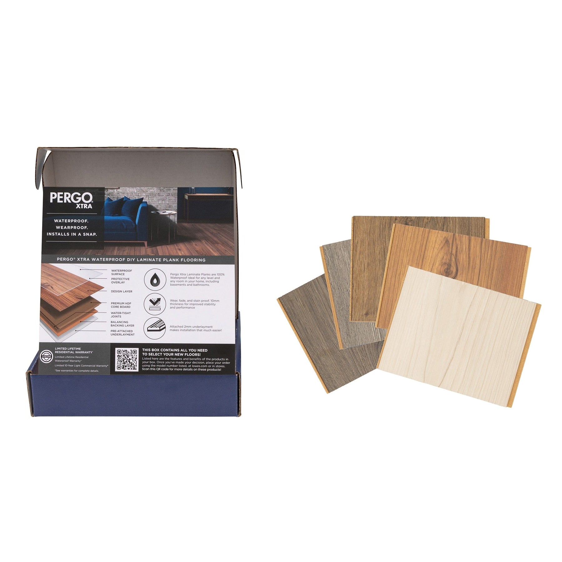 Discover the perfect flooring for your space with Pergo's Xtra Brown Waterproof Laminate Wood Plank Sample Kit. These premium laminate samples feature authentic wood grain styling, engineered for durability and easy installation with a built-in pad. Ideal for any room, including basements and bathrooms, this sample kit helps you envision your flooring transformation with confidence.