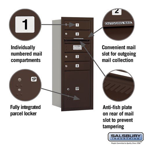 This recessed-mounted 4C horizontal mailbox features 10 tenant doors and a parcel locker, designed for USPS access and rear loading. Constructed from heavy-duty aluminum with a durable bronze powder-coated finish, it ensures security and compliance with USPS standards.