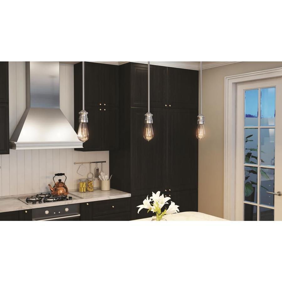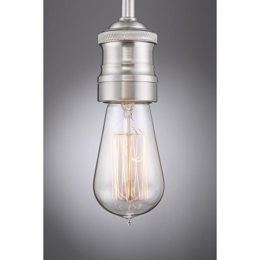 Features mouth blown clear glass and a brushed nickel finish Uses one 60 watt max wattage medium base bulb, not supplied For added style we recommend you use 60 watt vintage-style filament bulbs, not supplied There is a three year warranty on finish and a ten year warranty on electrical For versatility, this fixture can be used with or without the shade Dimmable for desired illumination levels when used with dimmable bulbs Sloped ceiling compatible ETL listed for damp location usage Hardware included for adjustable hanging heights