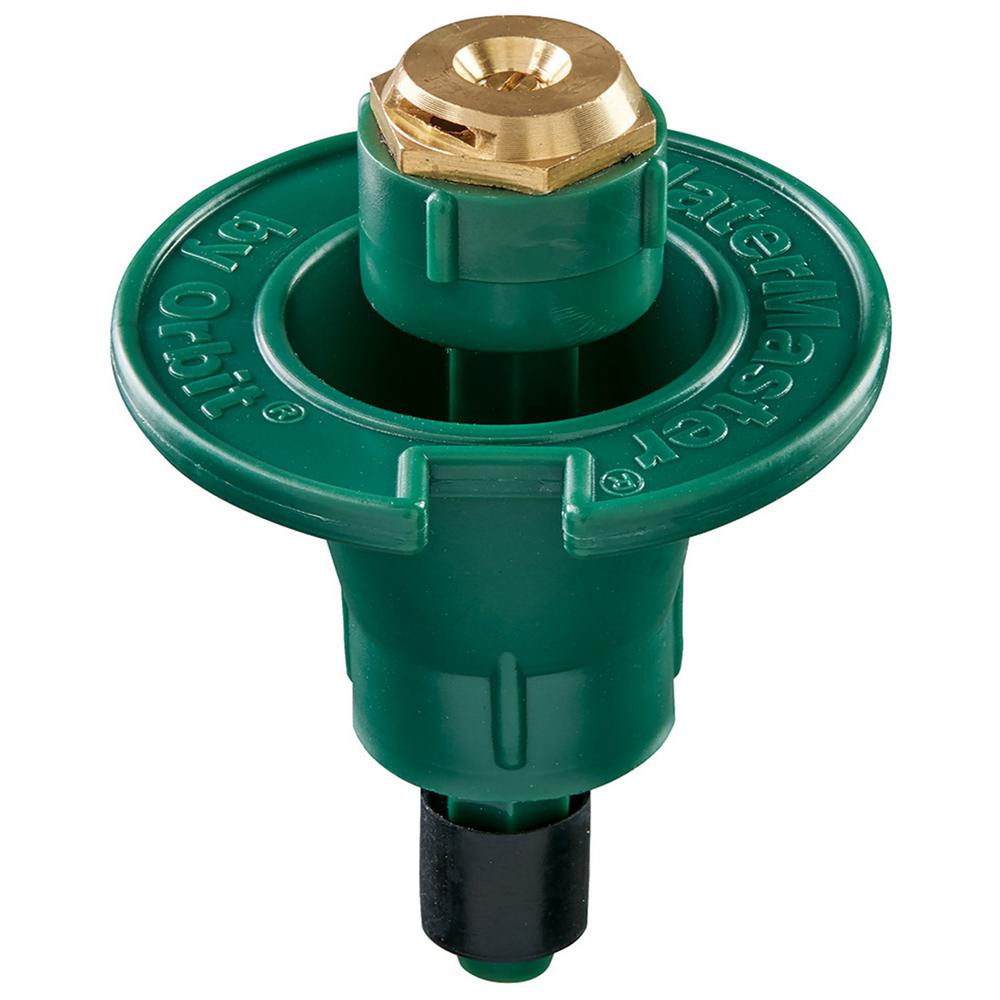 The Orbit Plastic Pop-Up Sprinkler features a 1/4 pattern brass nozzle and a brass flow-adjustment screw. This sprinkler covers up to 15 sq. ft. and is ideal for installation in a system in a medium-size yard.