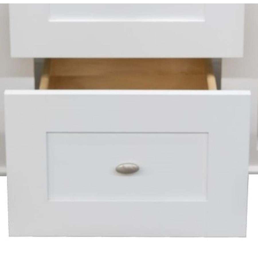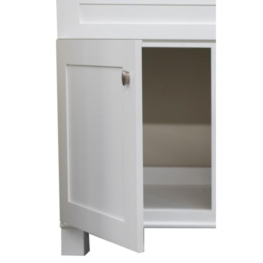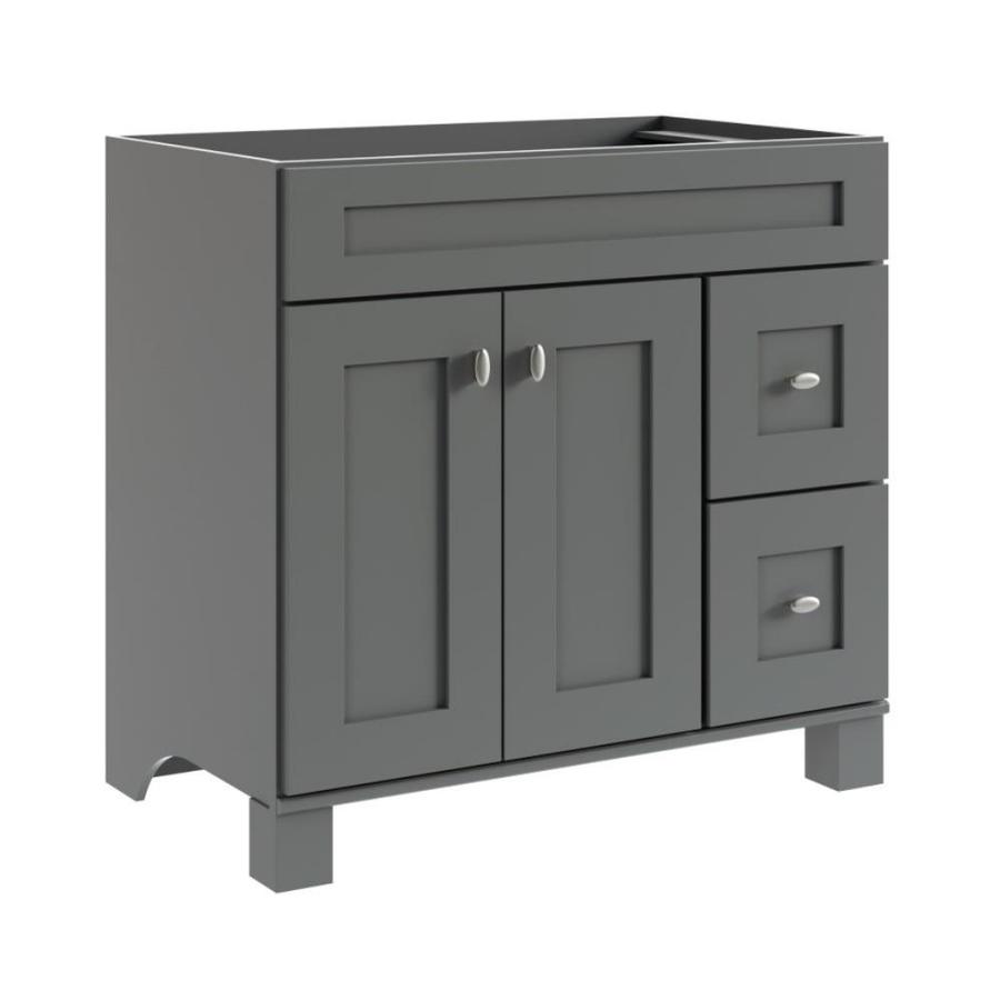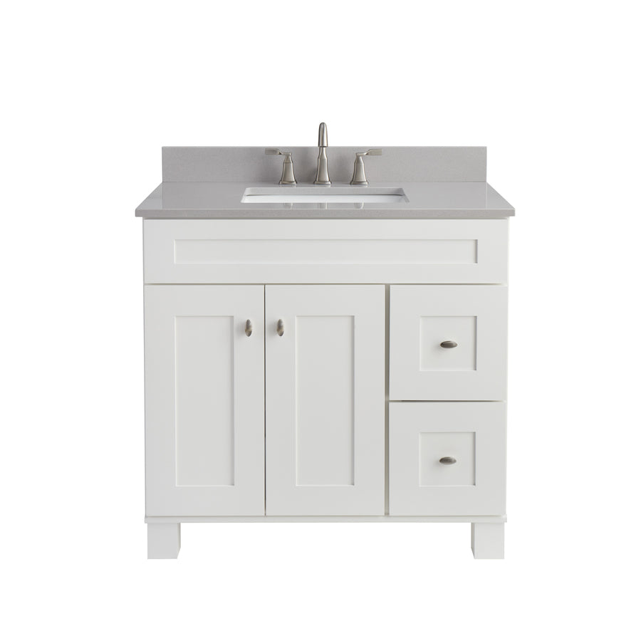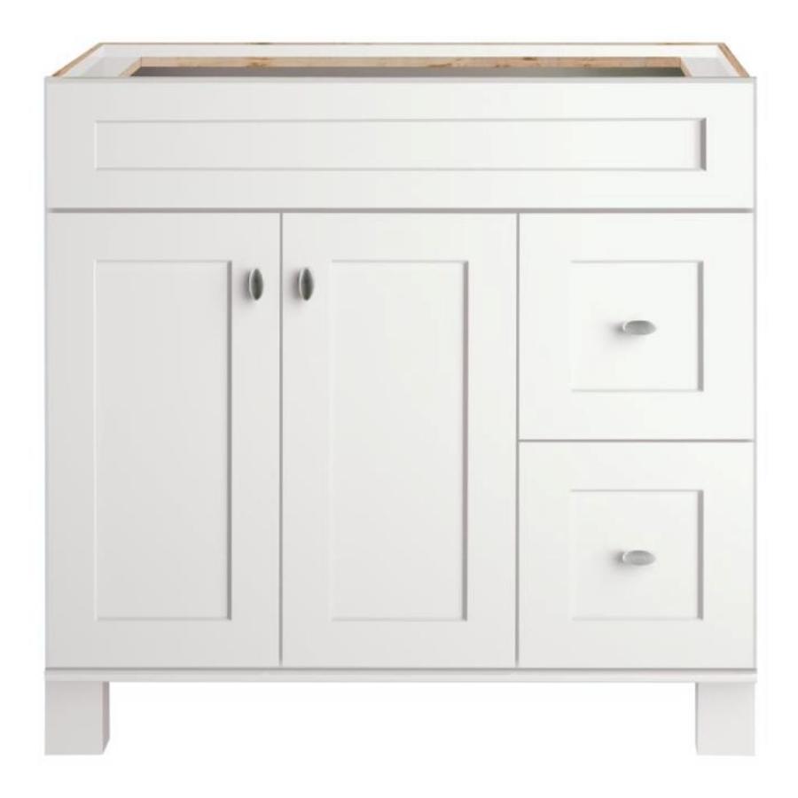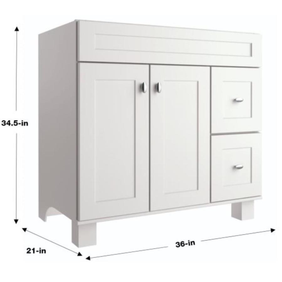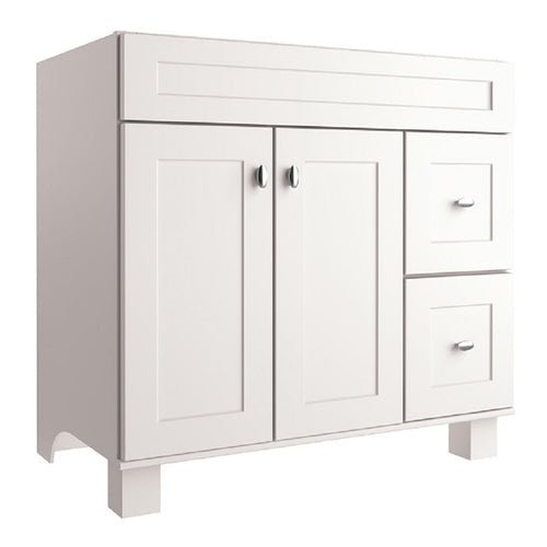White bathroom vanity from the Palencia collection offers a fresh, minimal design to complement a variety of bathroom decor Features 2 full-extension solid wood dovetail drawers and 2 SmartStop soft-closing doors Great for contemporary style decor Compatible with 37-in W x 22-in D vanity tops (sold separately) 36-In W x 21-in D bathroom vanity Brushed-nickel finish hardware adds a touch of shine Fully assembled and ready to be installed Select sizes available for pickup today in stores All collections and sizes available for delivery to store within 7 days or less