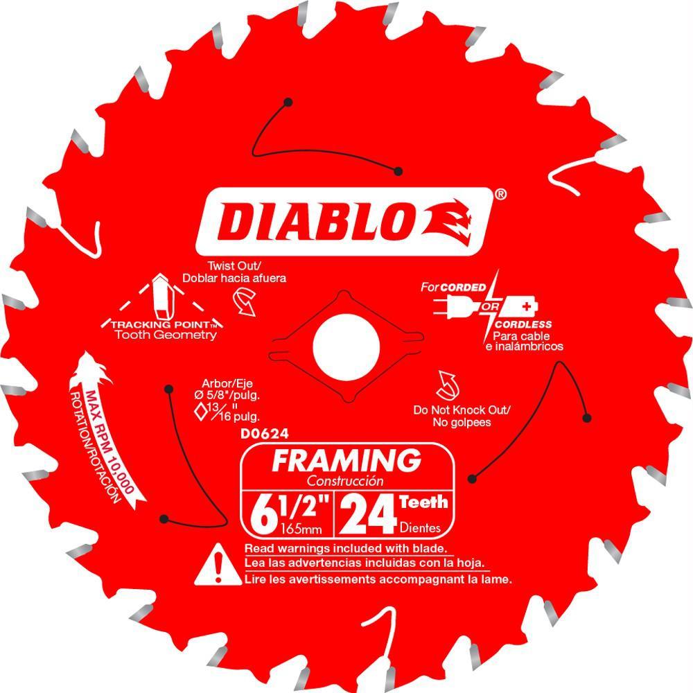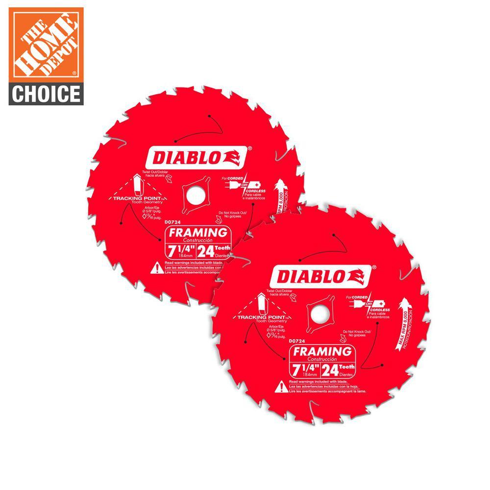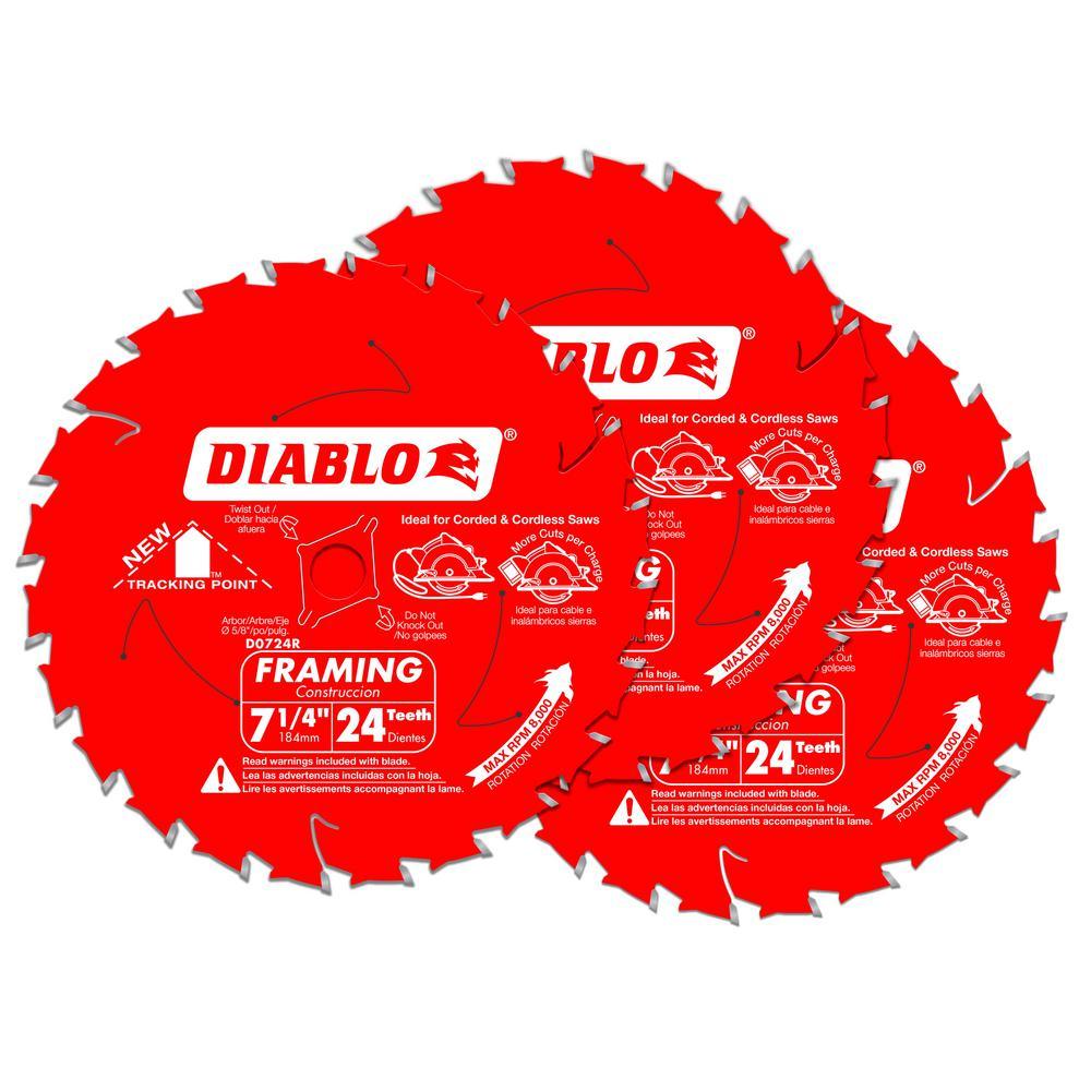 Diablos next generation 7-1/4 in. 24-teeth tracking point saw blades feature the first ever, tracking point tooth design and the newly enhanced anti-vibration design. Diablos 7-1/4 in. 24-teeth framing blade with new tracking point tooth design delivers maximum life and durability with effortless cutting performance for five times longer life, two times more durability and increased stability. Up your cutting game with this one-of-a-kind tracking point tooth grind for unmatched cutting performance and efficiency. This is the only 7-1/4 in. Blade on the market to include tracking point tooth design; making it ideal for framers, roofers, remodelers, concrete formers or anyone wanting ultimate cutting performance in pressure treated wood, 2x lumber, plywood, hardwoods and softwoods.