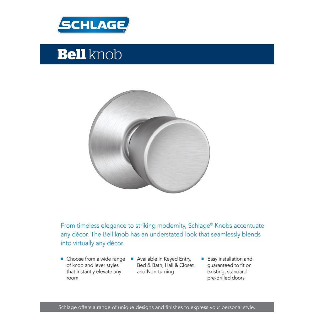 The Schlage Bell Satin Chrome Hall and Closet Knob is perfect for use on hall and closet doors where locking is not needed. The Bell knob has an understated look that seamlessly blends into virtually any decor and becomes especially edgy when finished in Satin Chrome. Plus, its been designed and tested with strength and durability in mind.