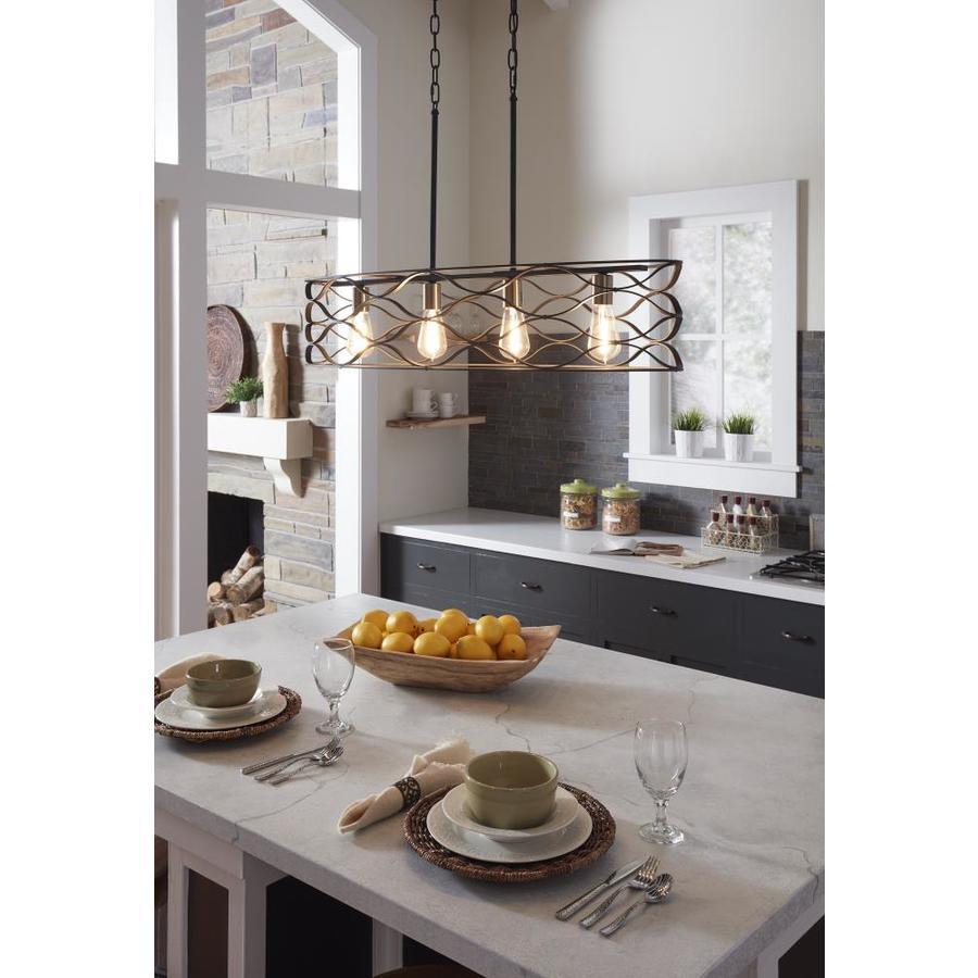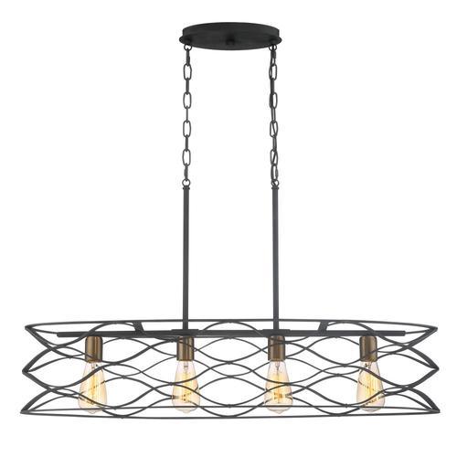 Features a hand-riveted frame with a mottled black finish and gold accents Uses four 60-watt max wattage medium base bulbs or CFL and LED equivalents, not supplied There is a 3 year warranty on finish and a 10 year warranty on electrical Complete the look of your room with the entire Unity collection - see related items Sloped ceiling compatible For added style we recommend you use 60-watt vintage-style filament bulbs Dimmable for desired illumination levels when used with dimmable bulbs ETL listed for damp location usage Hardware included for adjustable hanging heights up to 11 foot ceilings