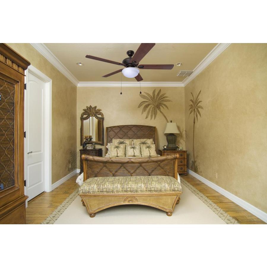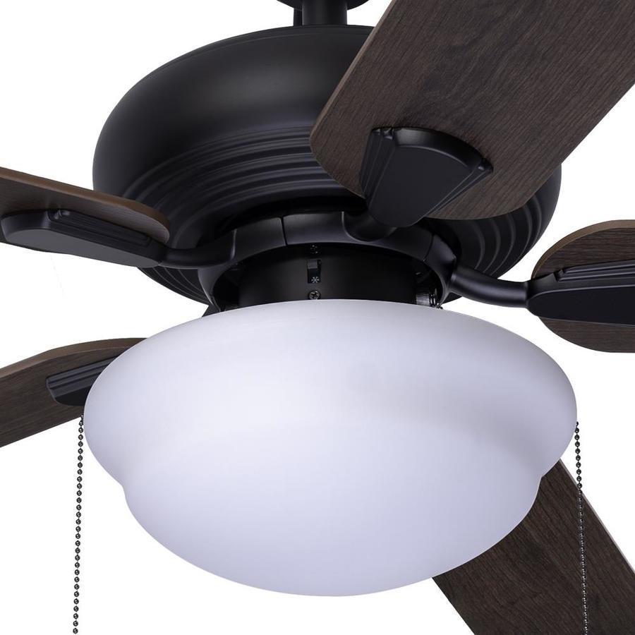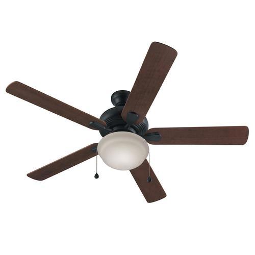 Bronze finish ceiling fan from the Caratuk River collection features 5 reversible blades in a cocoa/nutmeg finish Frosted marbleized glass, globe-style light kit includes one 6 watt LED bulb for energy-efficient illumination 52-in fan provides airflow up to 4,924-CFM, making it ideal for large rooms up to 400-sq ft 3 speed settings make it easy to customize your comfort level Reverse air flow feature allows you to change the direction of the fan according to the season, for optimal airflow all year long 4-in L down rod included for installation (angle mount capable) Great for casual or transitional style decor Limited lifetime warranty gives you peace of mind