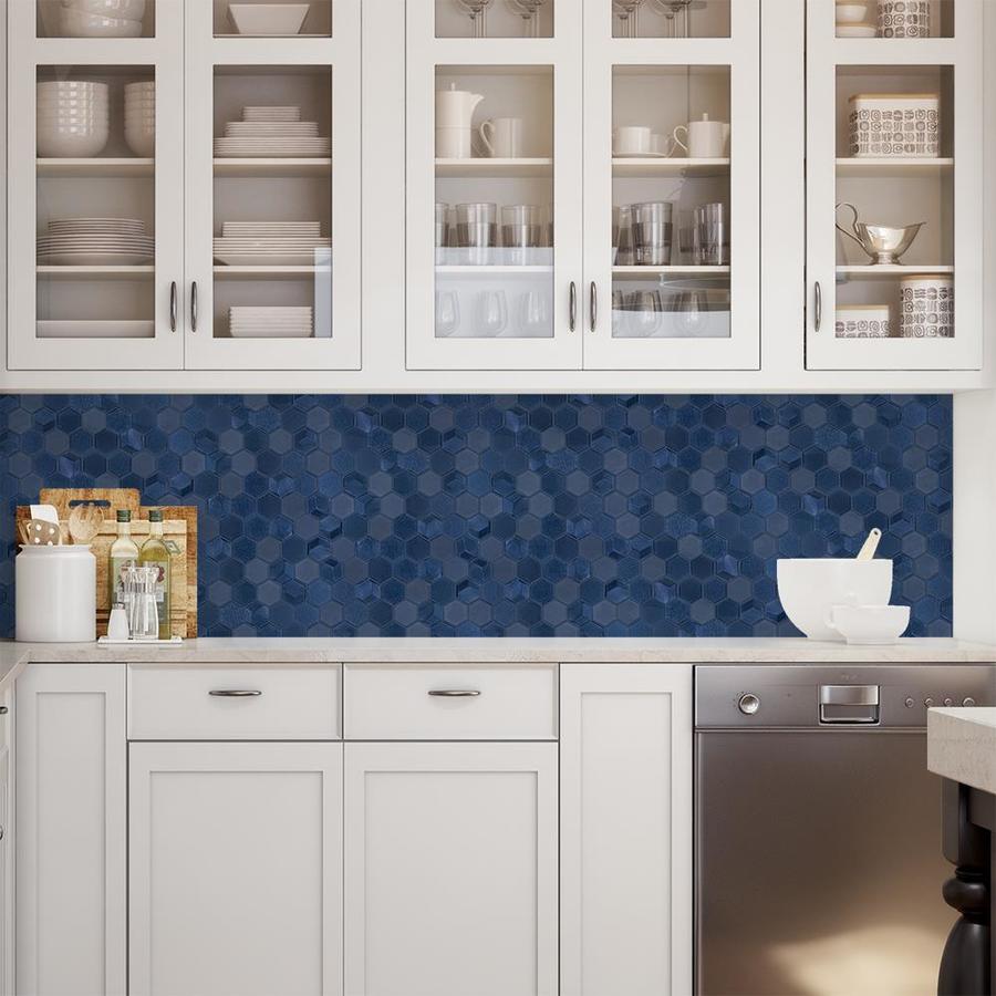 Glossy finish with smooth blue surface reflects light, adding dimension to any wall or backsplash