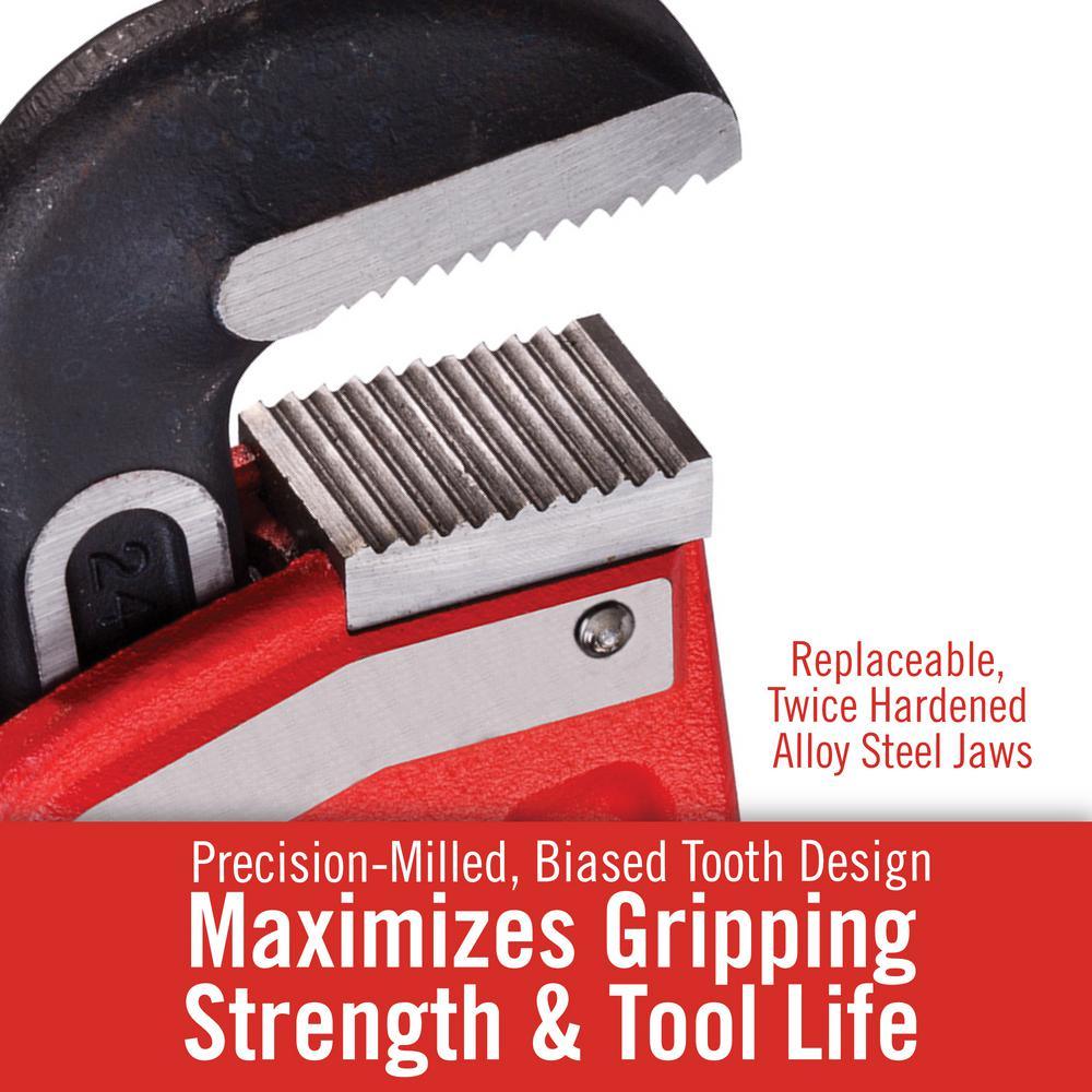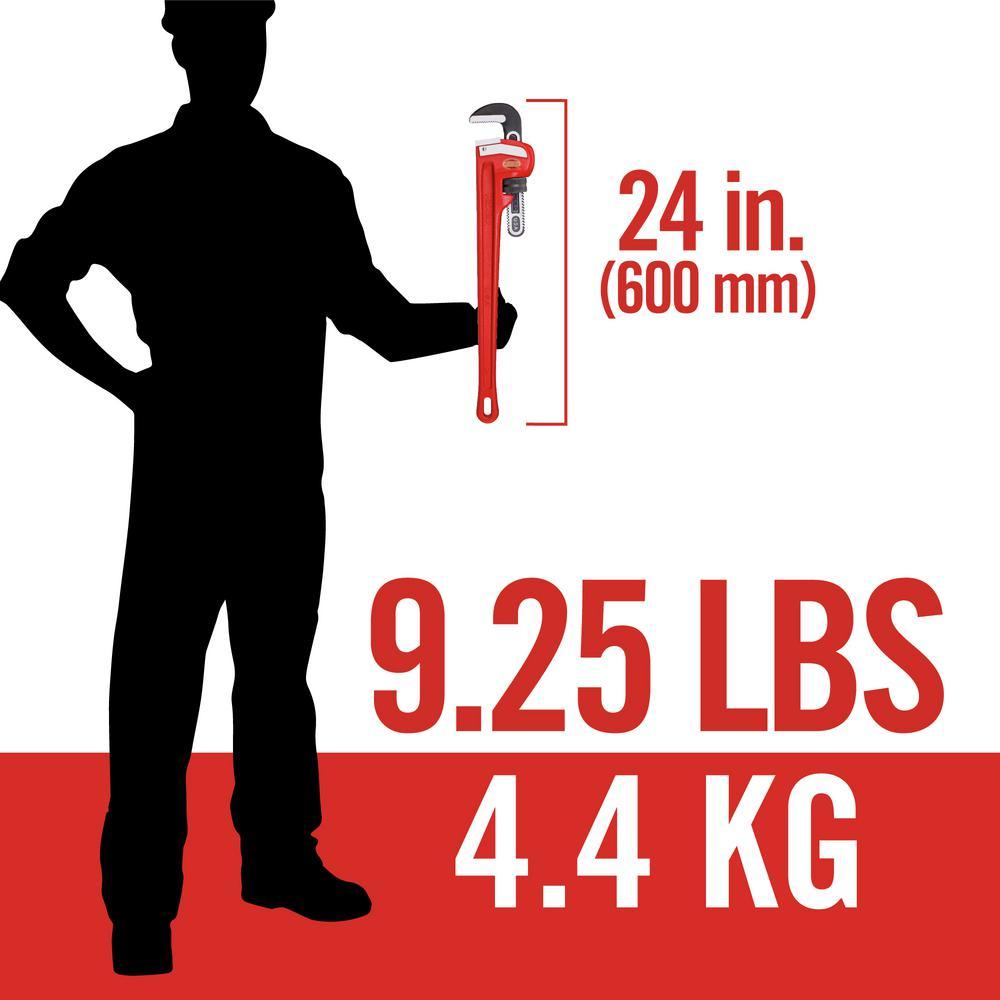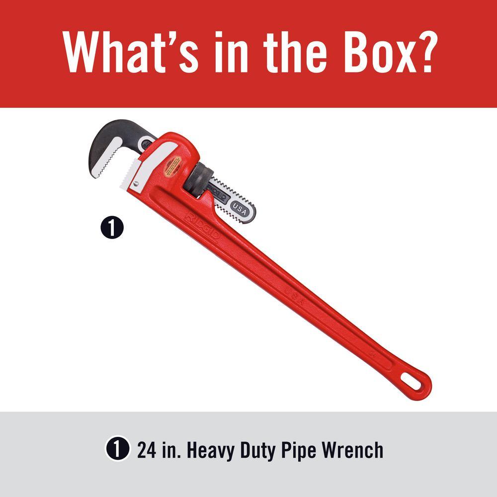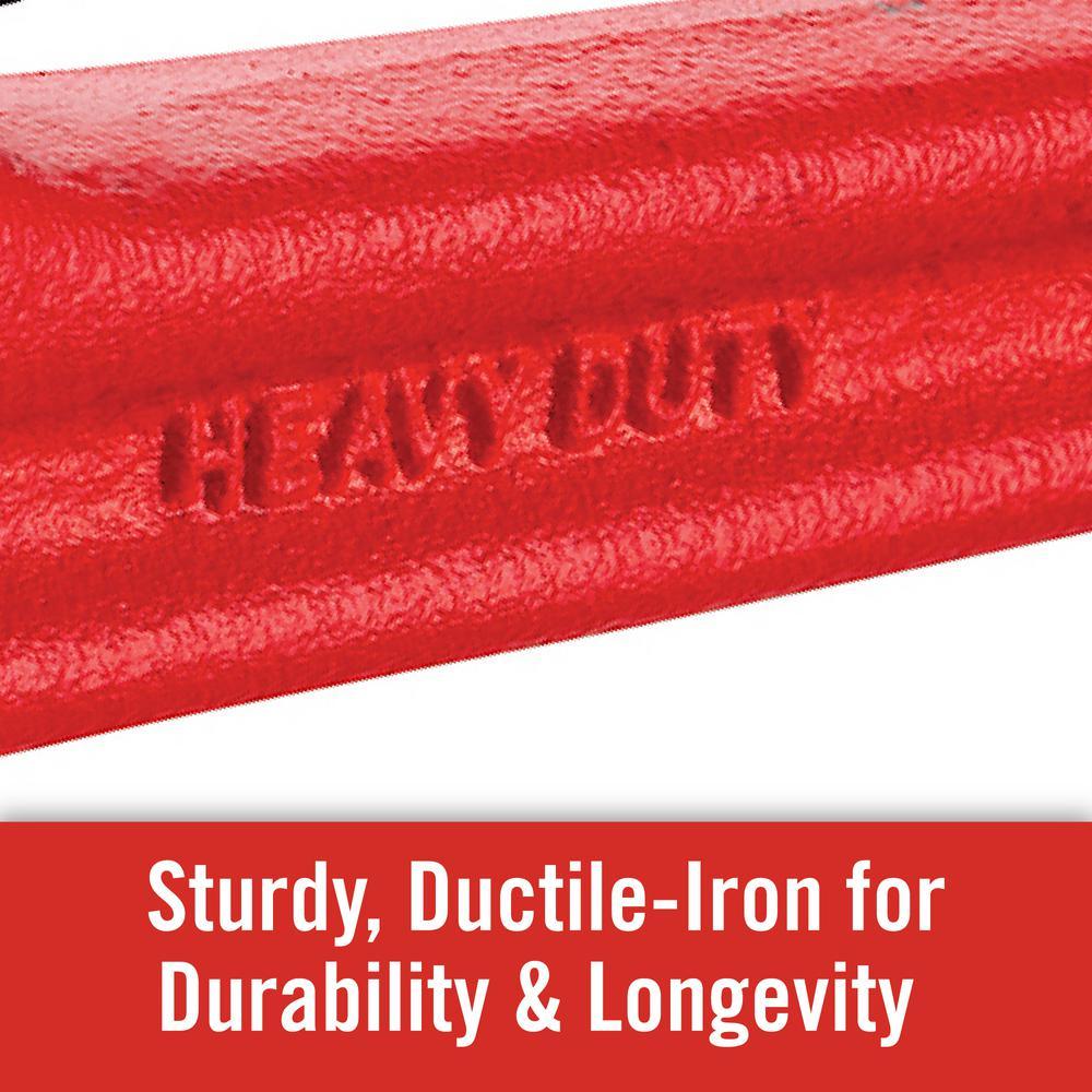 The Heavy-Duty Straight Pipe Wrench is ideal for a variety of plumbing and pipe work. It boasts a bold red hue for easy visibility on the job. At 24 in., this pipe wrench is great for use with pipe diameters of 1-1/2 in. to 2-1/2 in. with a capacity up to 3 in. Its sturdy ductile-iron housing and l-beam handle gives you the durability and strength you need while you work. It has a quickly adjustable full-floating forged hook jaw featuring self-cleaning threads and easily replaceable parts including a spring assembly, hook jaw and heel jaw.