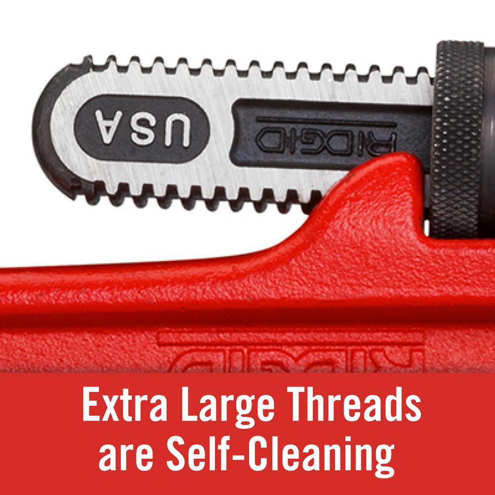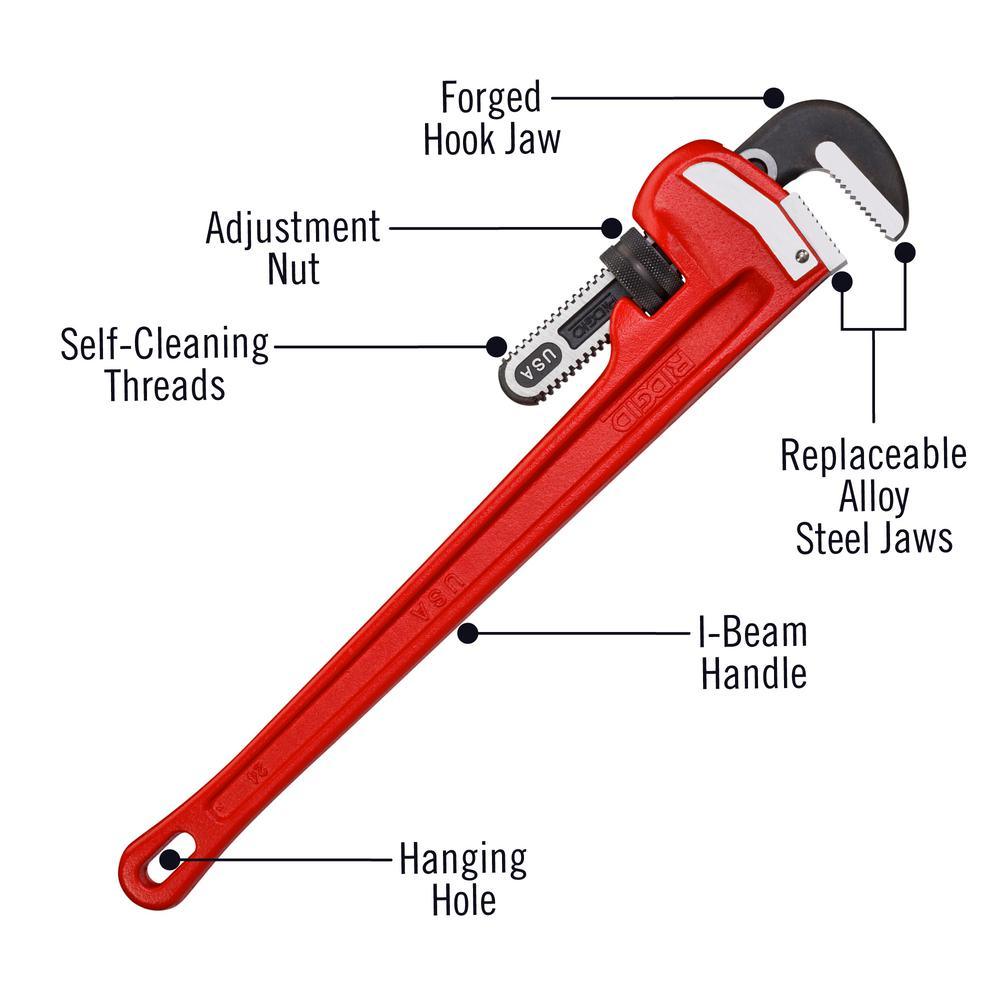 • RIDGID pipe wrench features reliable self-cleaning threads with easily replaceable hook jaw, heel jaw and spring assembly