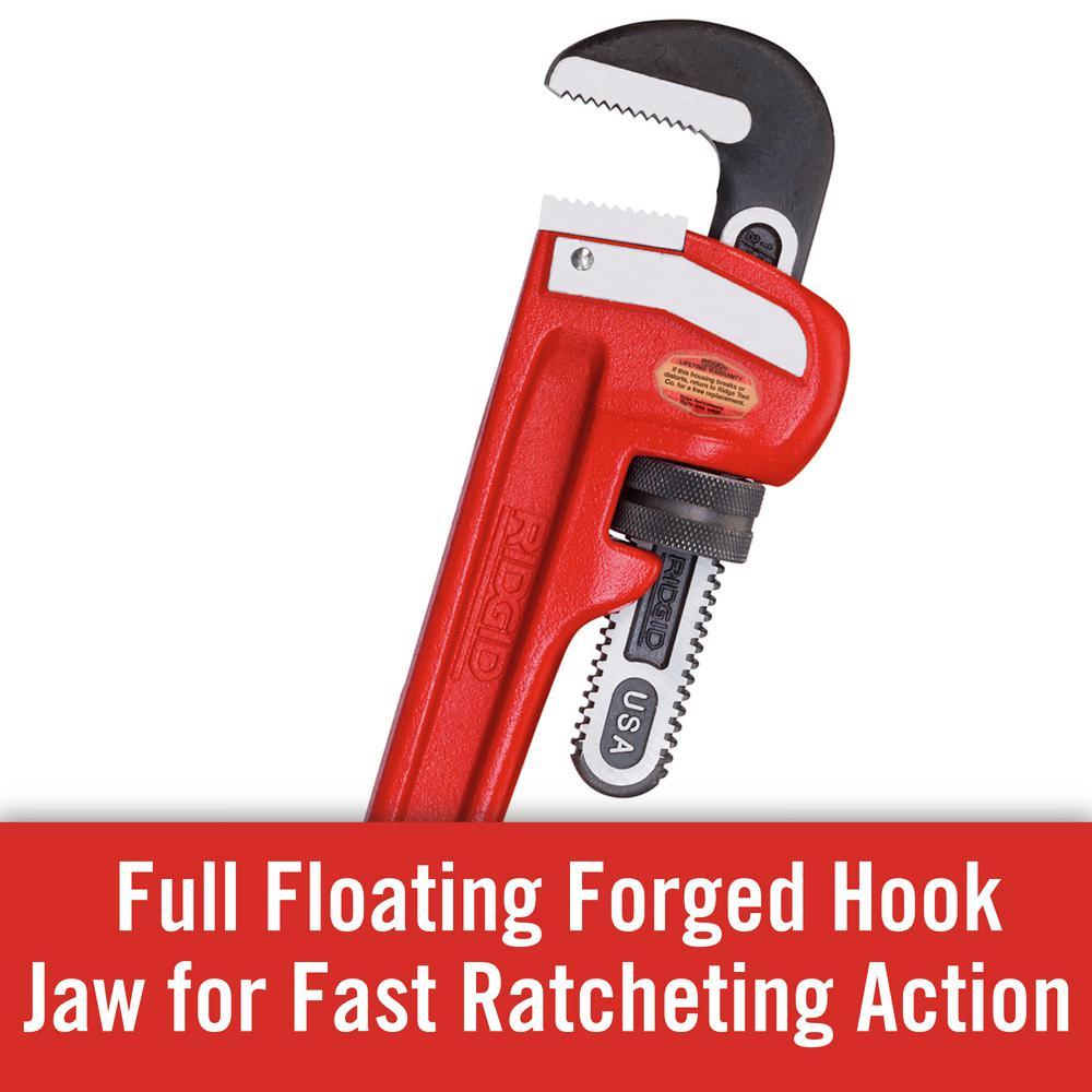 • Heavy-duty pipe wrench features a full floating forged hook jaw for superior gripping and quick adjustments