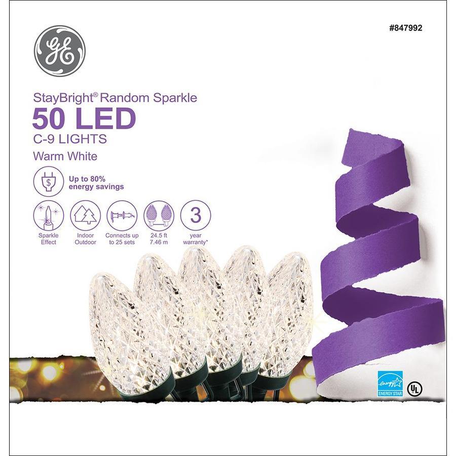 50-Count GE StayBright LED warm white C9 random sparkle Christmas string lights Green cord with 24.5-ft lighted length matches your Christmas decor and illuminates your home's interior or exterior Can connect with up to 25 sets to make decorating your home a breeze Replacement bulbs and fuses included for added convenience ENERGY STAR qualified products help you save money on utility bills without sacrificing performance, style or comfort UL safety listing demonstrates this product has met minimum requirements of widely accepted product safety standards 3-Year limited warranty gives you peace of mind Perfect for Christmas trees, ceilings and roof lines Available only at ARB265W