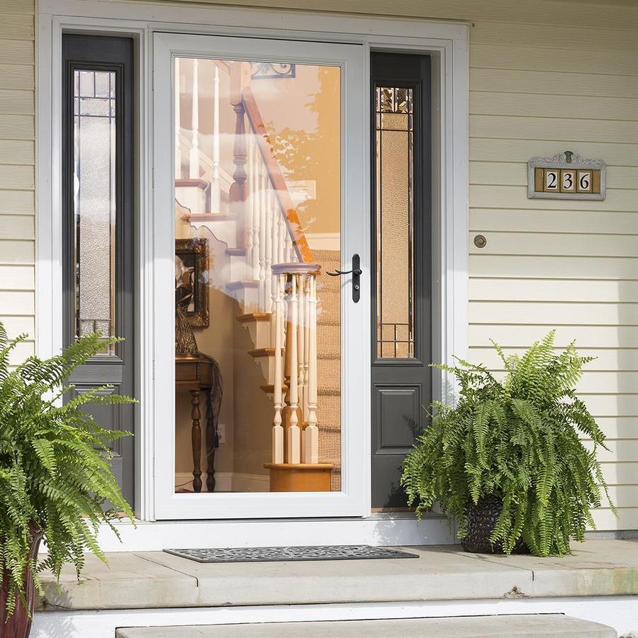 Full glass, modern design storm door allows maximum natural light into home and enhances your view Built-in closing system is hidden out of sight at the top of door, providing a clean look inside and out Innovative Click&Hold™ keeps the door open when hands are full by simply pushing the door open until you hear an audible catch For seasonal ventilation, the BetterVue® interchangeable screen brings more light and airflow into your home The Quick Fit™ handle set is easy to install and includes a built in deadbolt for peace of mind The QuickFit™ lock with built-in deadbolt enhances security protection and elegance Overlapping edge and dual weatherstripping seal out harsh weather and provide a tight seal to keep out drafts Designer screw covers conceal exterior screws for a finished look EasyHang® helps cut installation time in half with reversible hinging to accommodate left or right swing doors
