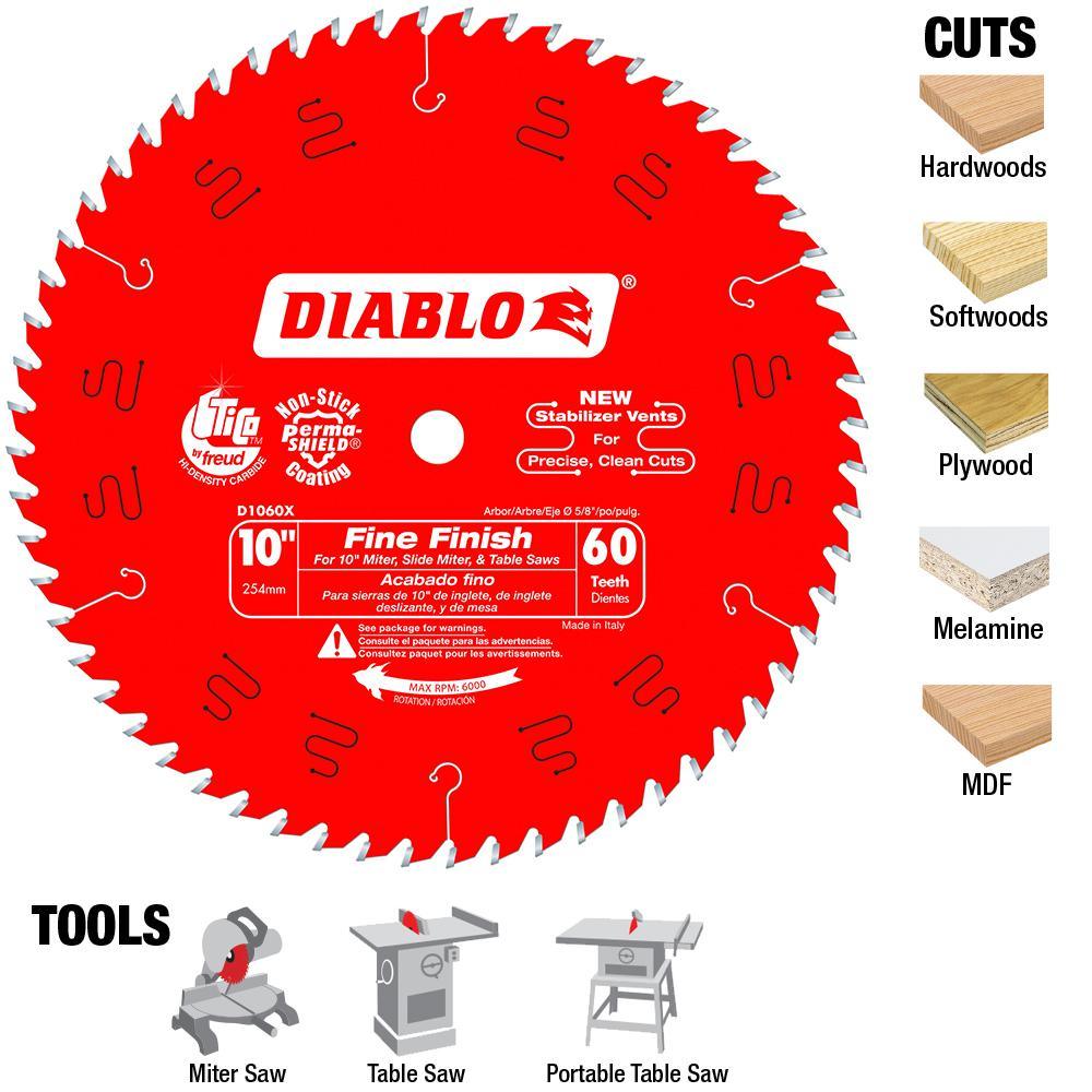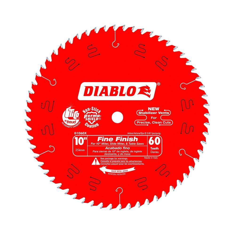 Diablo's next generation 10 in. x 60 Tooth Fine Finish Carbide Circular Saw Blade features new laser-cut stabilizer vents for precise and clean cuts in a variety of wood materials. The advanced stabilizer vents feature a permanent filler baked in from top to bottom for absorbing noise and preventing sideways movement, allowing the blade to slice through wood cleanly, quickly and accurately. Constructed with TiCo Hi-Density special-blend carbide, Diablo's 10 in. fine finish blade produces precise cuts and provides 5X longer cutting life. The laser cut heat expansion slots allow the blade to expand and contract during use, keeping the cut true and straight. This blade is excellent for trim work and projects such as building bookcases, cabinets and shelving.