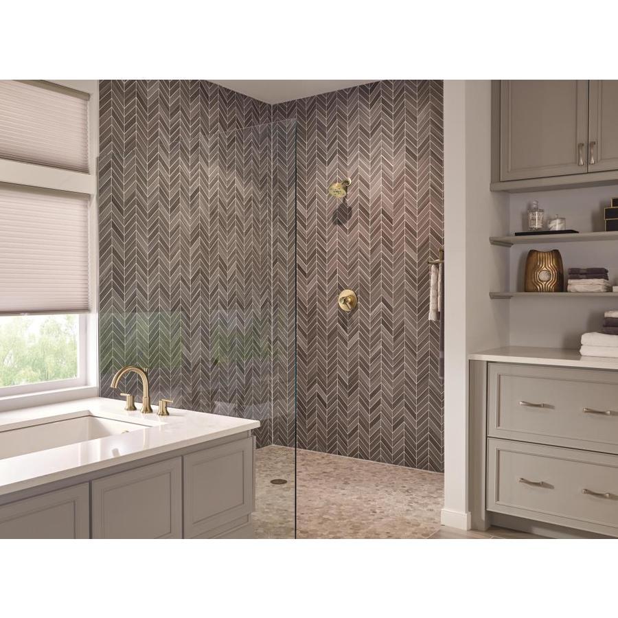 H2Okinetic® Shower technology sculpts water into a unique wave pattern, forming a powerful drench spray Gives you the feeling of more water without using more water Control volume and water temperature independently with two separate handles for more refined control of your shower experience Monitor® pressure balance valve keeps water temperature within a safe 3 ° F (1.6 ° C), helping to protect you from sudden changes in hot or cold water pressure Spray settings include: H2OKinetic spray H2Okinetic spray creates a shower with more warmth, coverage and intensity Trim kit only, must order MultiChoice® Universal Valve (R10000-LBX or R10000-UNBX) separately to complete the unit 2.00 gpm at 80 psi, 7.6 L/min at 550 kPa ADA Compliant