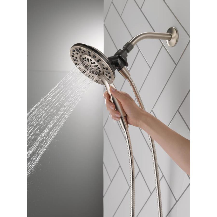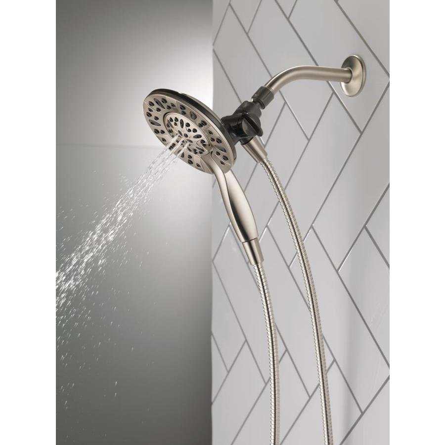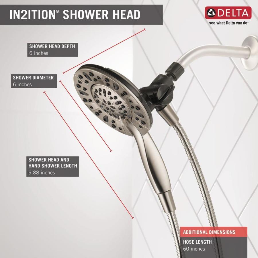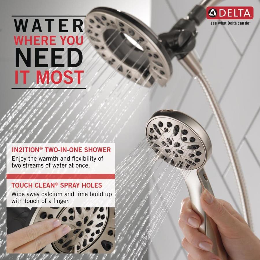 The In2ition® Two-in-One Shower gets water where you need it most using the integrated shower head and hand shower separately or together Perfect for bathing loved ones and pets as well as keeping the inside of your shower and tub clean Soft, rubber Touch-Clean® spray holes allow you to easily wipe away calcium and lime build-up from the spray face of your shower head and hand shower with the touch of a finger Installs in minutes Spray settings include: full body spray, full spray with massage, massaging spray Pause feature reduces water to a trickle, giving you space for shaving, lathering and other shower tasks while maintaining your temperature settings Includes 60-in hose