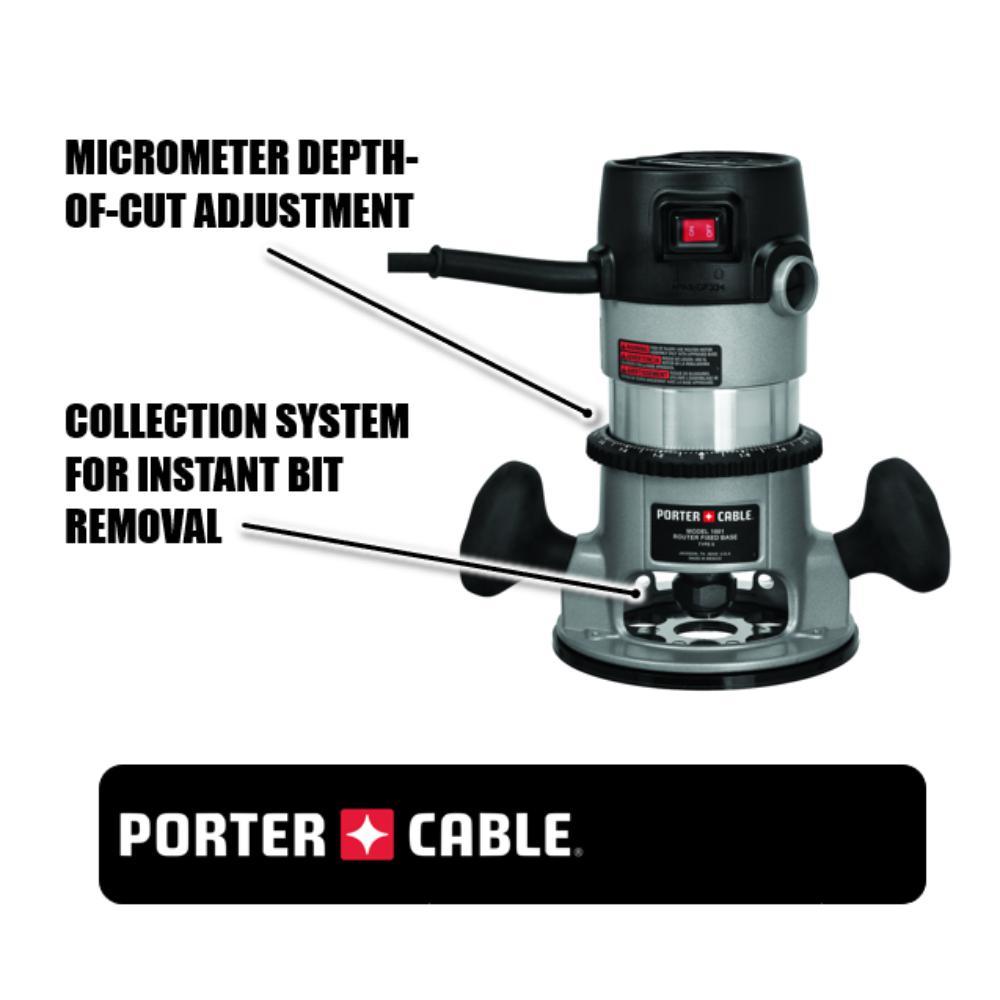 The Porter-Cable 1.75 HP Fixed Base Router Kit is a reliable and versatile router system that was designed to match your woodworking needs. With its 11 Amp motor that delivers 27,500 RPM, you have the power to tackle tough materials. The router features precision-machined, aluminum motor housing, a base and a micrometer depth-of-cut adjustment that is accurate to 0.0078 in.