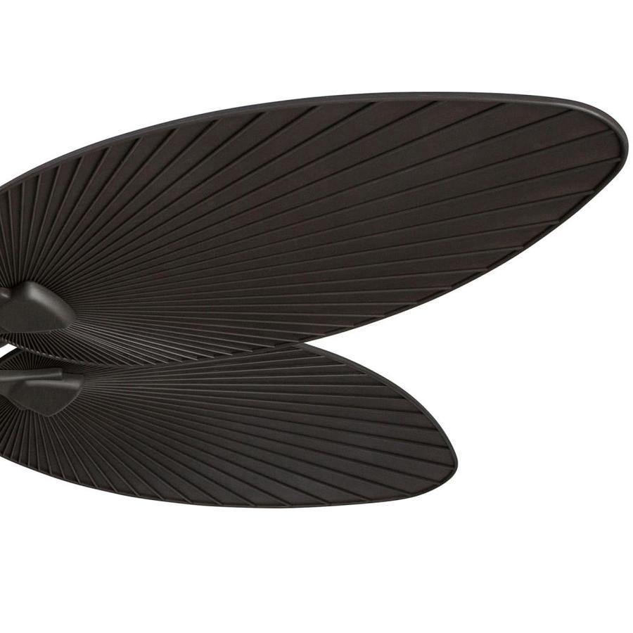 Features a bronze finish and 5 damp rated, palm leaf fan blades