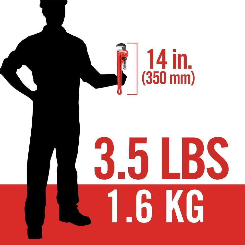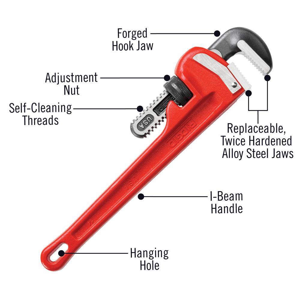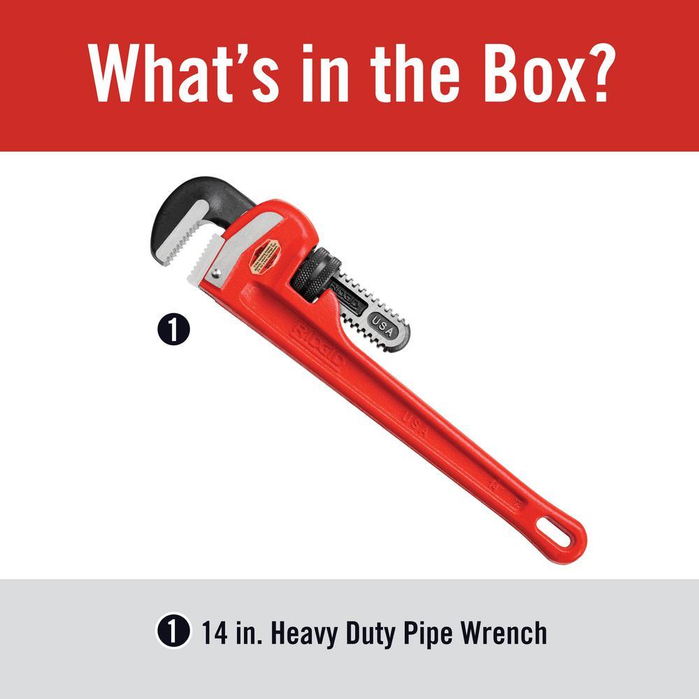 A useful addition to any plumber's toolbox, the RIDGID 14 in. Heavy-Duty Straight Pipe Wrench is a plumbing wrench that features sturdy ductile-iron housing and an I-beam handle for exceptional durability and leverage. This RIDGID pipe wrench has a quickly adjustable full-floating forged hook jaw featuring self-cleaning threads and easily replaceable spring assembly, hook jaw and heel jaw. A versatile plumbing tool, this straight pipe wrench is suited to all types of pipe work and comes in a convenient red color that is always easy to find. This 14 in. plumbing wrench is ideal for pipe diameters of 1/2 in. to 1-1/2 in. with a capacity of up to 2 in.