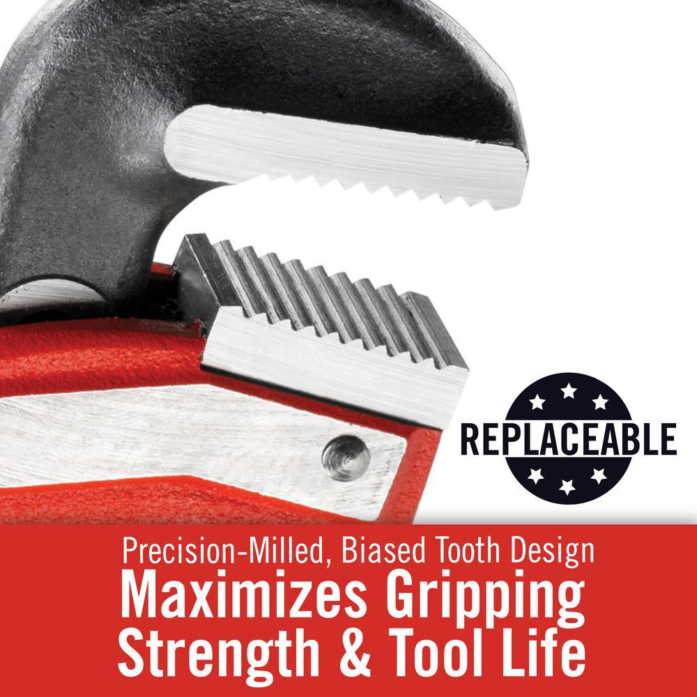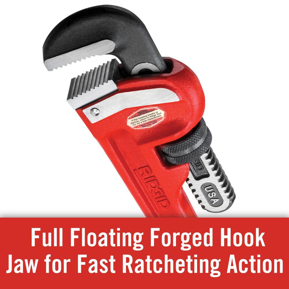 • Heavy-duty pipe wrench features a full floating forged hook jaw for superior gripping and quick adjustments