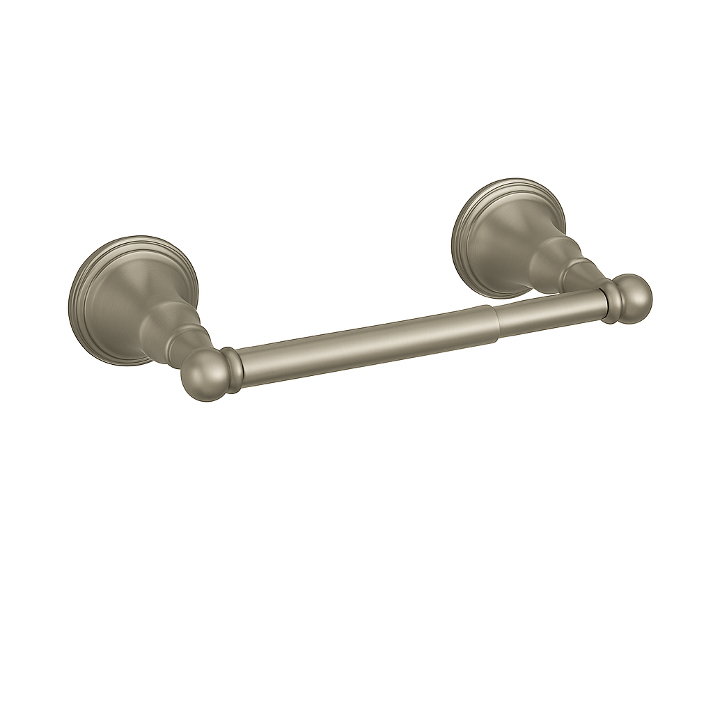 The Kelston toilet paper holder by KOHLER combines traditional and modern design elements, featuring a brushed nickel finish and durable metal construction. Its innovative pivot mechanism simplifies roll changes, making it a practical and stylish addition to any bathroom.