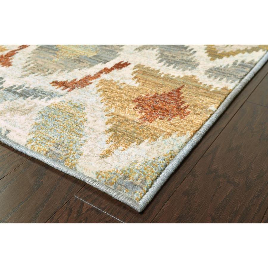Lamonte is a bold casual styling and high fashion translation of a tribal/abstract pattern Machine woven of a nylon/polypropylene blend for strength and shine 0.4-in pile height offers lasting durability and easy cleaning Rug pad recommended to prevent slipping for added safety, and extend the life of your rug (pad sold separately) Spot clean with mild detergent and vacuum regularly to keep rug looking like new This design features heavily saturated shades of ivory, gray, and light blue Initial creasing is normal and the creases will fall out within a few weeks, we advise reverse rolling to aid in the removal of creases 7-ft 10-in x 10-ft 10-in size is perfect for living rooms, bedrooms, and dinning rooms
