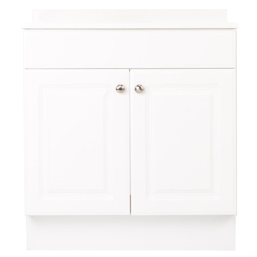 This Java single sink bathroom vanity features a complementary finish to suit any color scheme. Its white cultured marble top seamlessly integrates with the sink, making it a one-piece design. Ideal for traditional decor, it is pre-drilled for a 4-inch centerset faucet for convenient installation (faucet sold separately). The brushed nickel finish hardware adds a sleek touch, while the two raised-panel cabinet doors with 6-way adjustable hinges offer easy access to storage space. Fully assembled and ready for installation.