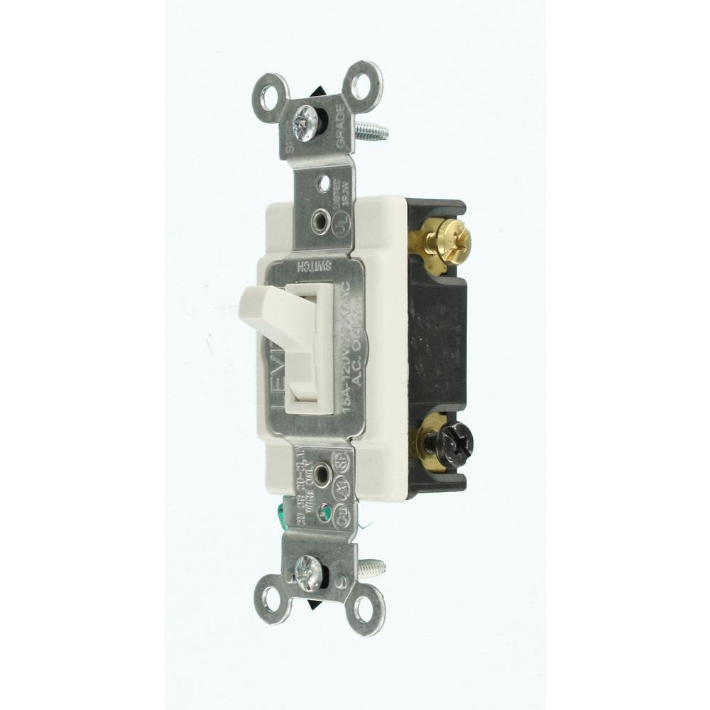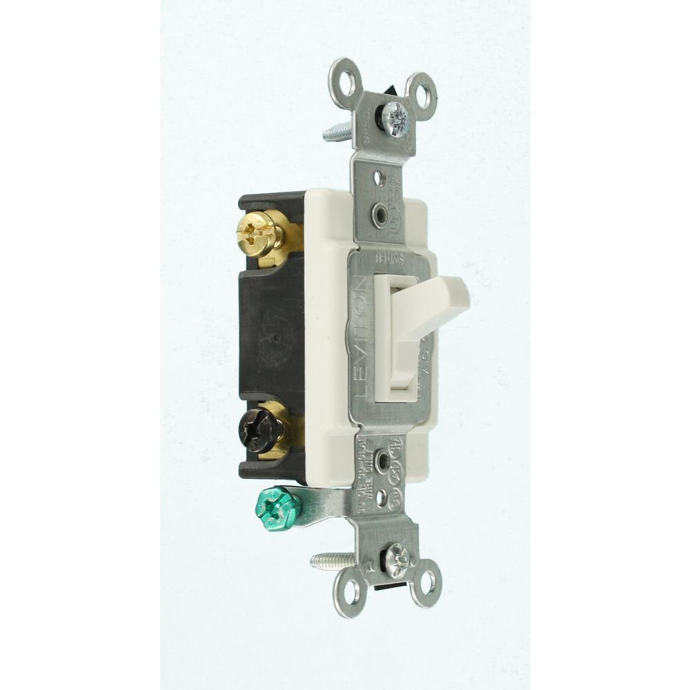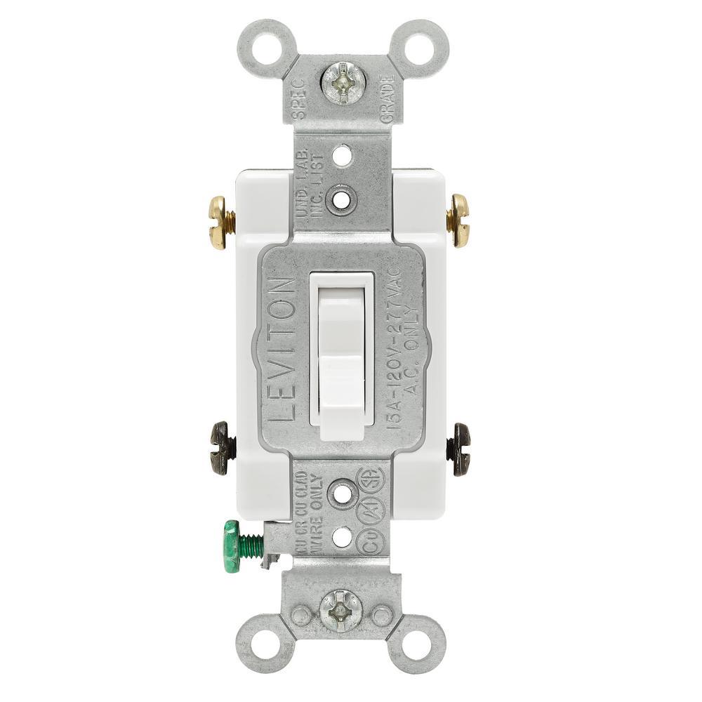 Leviton's Commercial Grade switches are designed to provide exceptional dependability and superior efficiency in commercial environments. Suitable uses range from municipal facilities to government buildings, malls to department stores, hospitals to healthcare facilities, and offices to educational and cultural institutions. Switch options include single-pole, double-pole, 3-way, 4-way, lighted handle, pilot light, locking, maintained and momentary contact, motor starter, safety-disconnect, and Decora designer-styled devices. This particular white-finished switch offers a 15 Amp/120-Volt AC rating with quiet, reliable mechanical action and faster installation thanks to a combination of side wiring and quick wire push-in connections, complete with grounding screws.