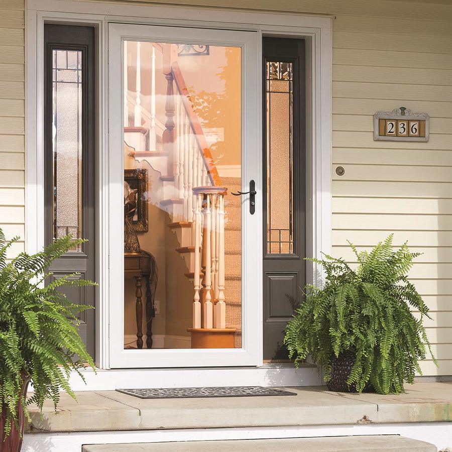 1-5/8-In thick heavy-duty, sturdy frame constructed with a maintenance-free aluminum Interchangeable glass and screen panels allow for seasonal ventilation The Quick Fit™ lock has a built-in deadbolt for added security Overlapping edge and dual weather stripping seal out harsh weather and provide a tight seal to keep out drafts Dependable two closer system with hold open feature allowing hands free operation; tap bottom button to hold door open and release by pushing slightly on door Designer screw covers conceal exterior screws for a finished look Interchangeable screen included for seasonal ventilation EasyHang® installation is faster and easier than traditional methods and offers a no-cut system with mounting rail extenders for an exact fit every time REVERSA-HINGE for right or left mounts