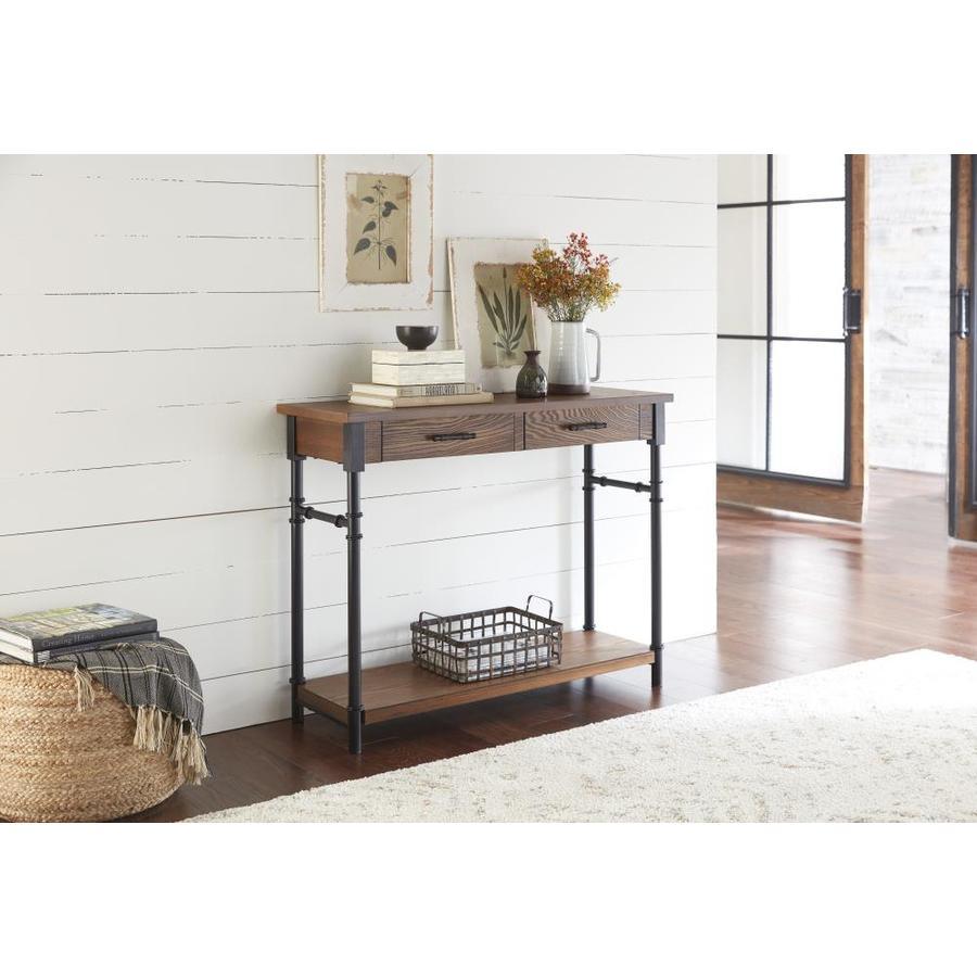 The mixed material of this piece, adds a touch of modern, contemporary style to any room Two functional drawers and a smooth table top for your storage and decorating needs Features metal accents and bronze hardware Easy to assemble