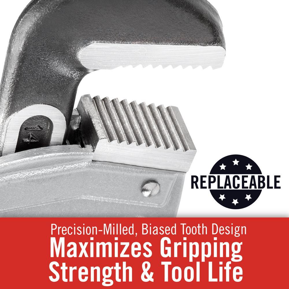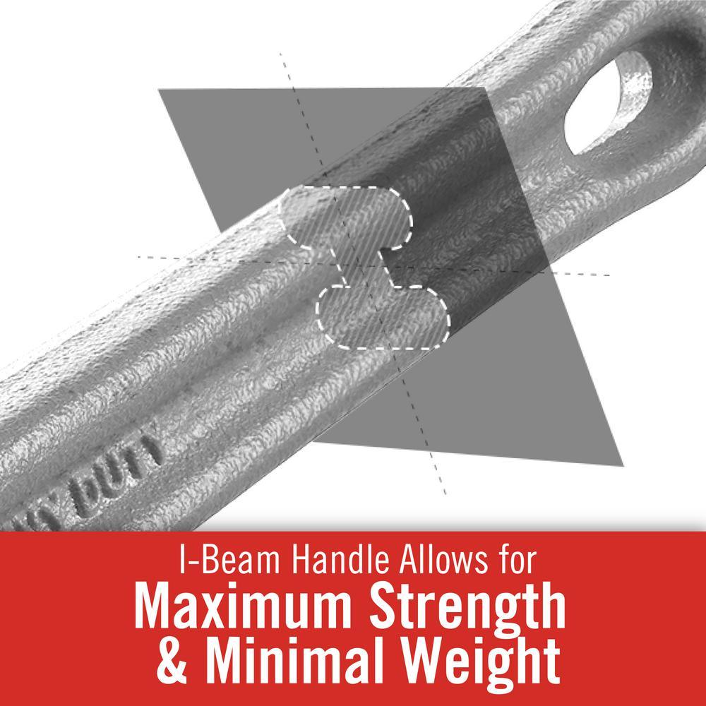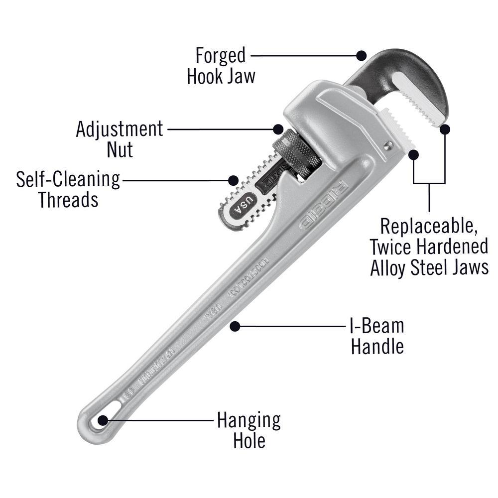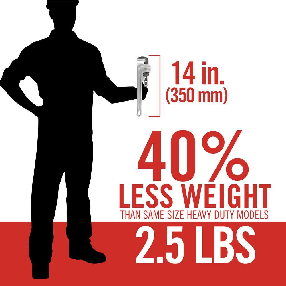 • Aluminum pipe wrenches reduce fatigue by lessening the weight and this 14 in. wrench weights only 2-1/2 lbs.