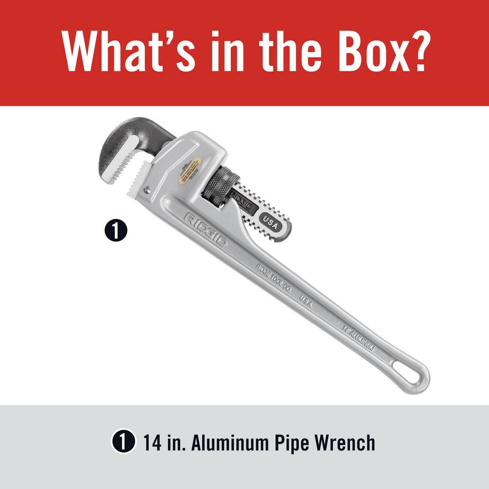 The RIDGID 814 14 in. Straight Aluminum Pipe Wrench offers professional strength and quality in a convenient, lightweight design. Nearly 40% lighter than comparable iron models, this pipe wrench delivers the renowned durability and ease-of-use that all RIDGID heavy-duty pipe wrenches are known for. It has a sturdy I-beam handle with quickly adjustable full floating forged hook jaw. The jaw features self-cleaning threads and easily replaceable spring assembly, hook jaw and heel jaw for long-lasting use. This 14 in. straight pipe wrench is ideal for pipe diameters of 1/2 in. to 1-1/2 in. with a capacity of up to 2 in. and is suitable for all types of pipe work.