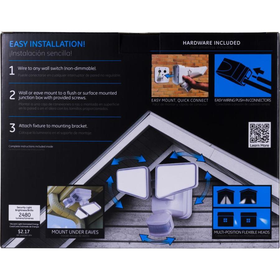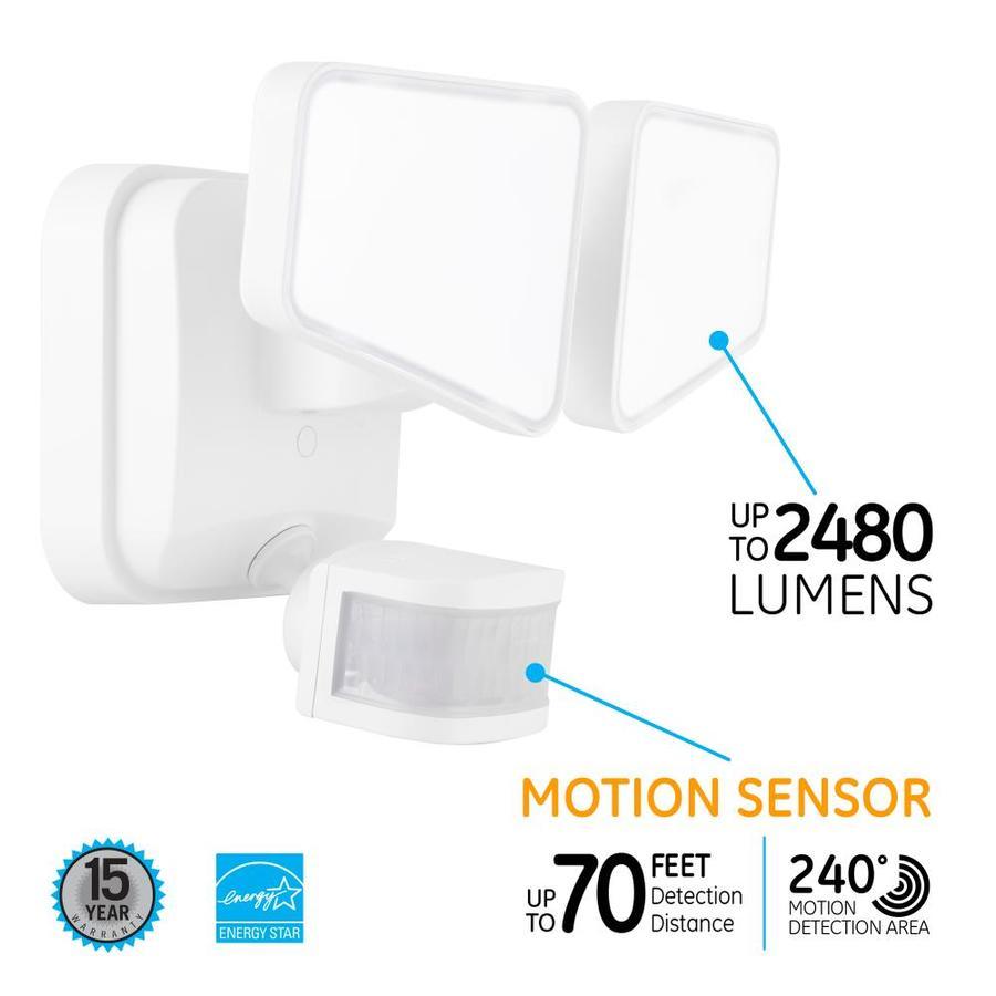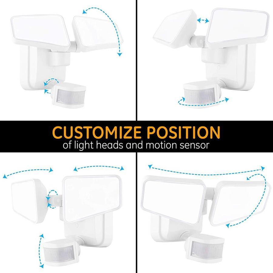 In security mode, when motion is detected the light will come on at its brightest daylight white 5000k, 2480 lumens. The two flexible light heads and 240 ° motion detection area provide diverse coverage options