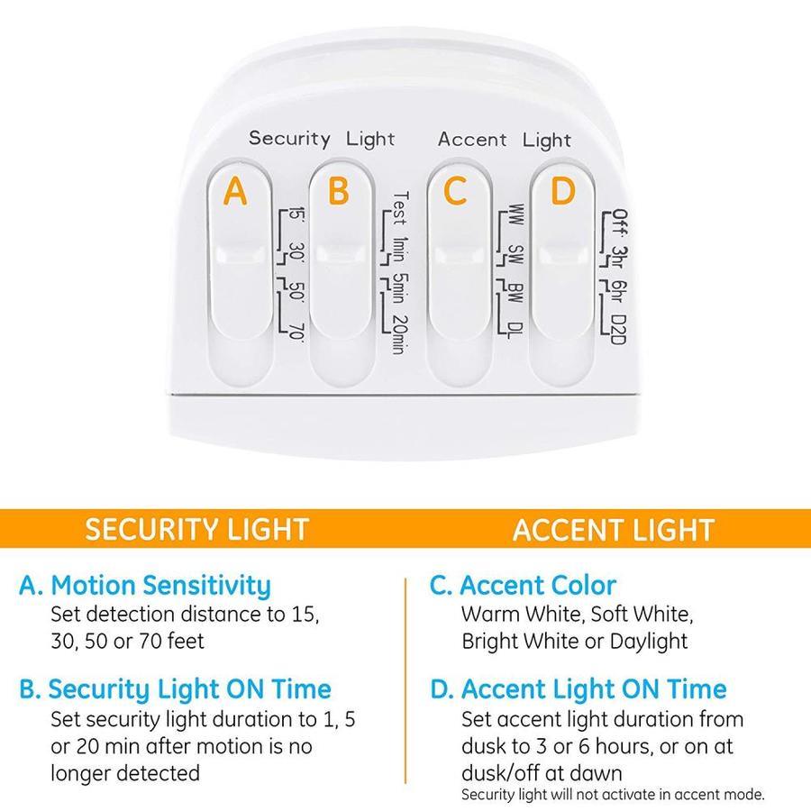 Then choose your accent light time, either dusk to 3 hrs or 6 hrs, or choose all night with built-in DUSK to DAWN sensor or no accent light at all. While accent setting is in use, the security light will not be activated