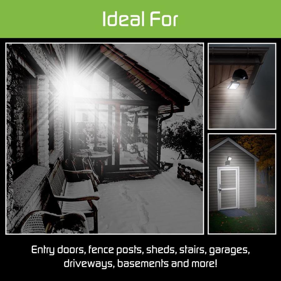 Weather-resistant for outdoor use and IP54 rated. Ideal for: entry doors, porch, patio, fence posts, sheds, garages, driveways, basements and more