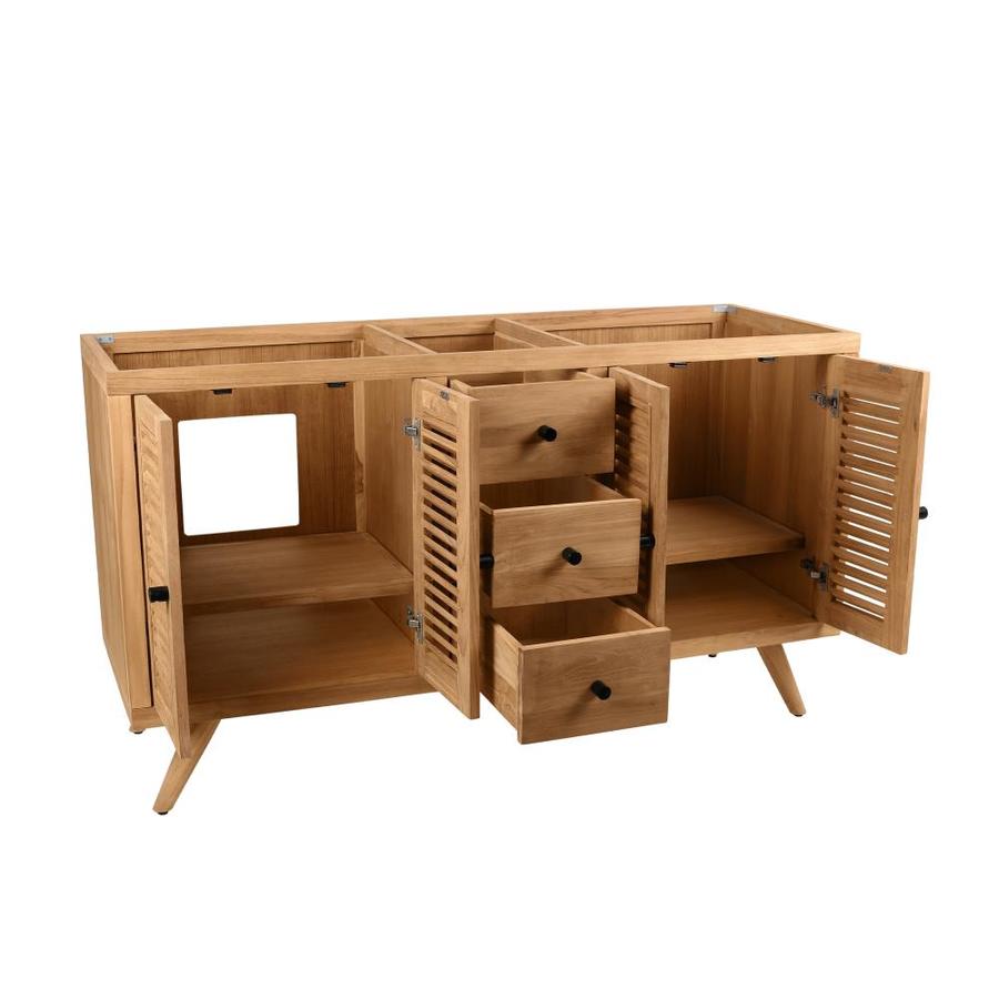 60W x 21D x 34H inches Solid teak wood, plywood Natural teak finish Black bronze finish hardware 4 soft-close doors, 2 interior shelves 3 soft-close drawers Adjustable height levelers Vanity top, sink and faucet not included