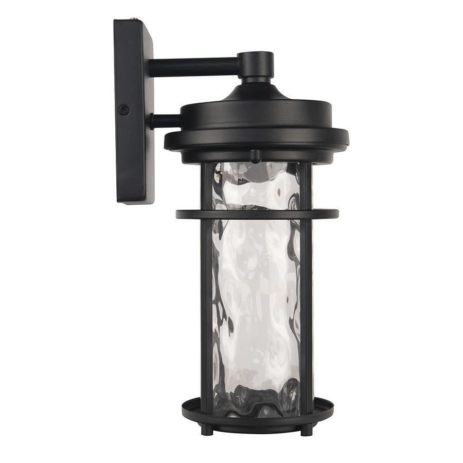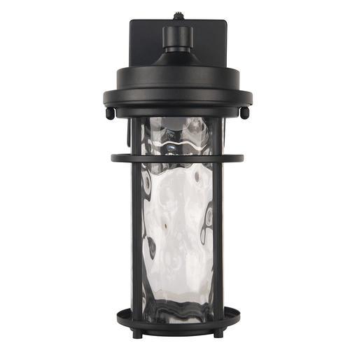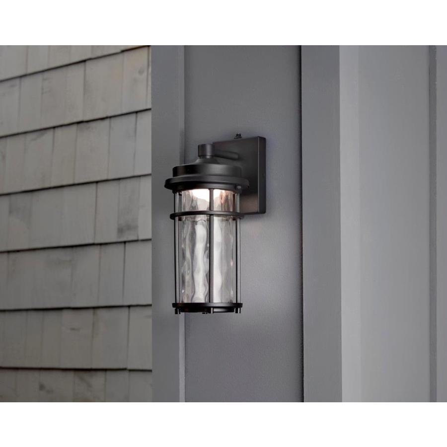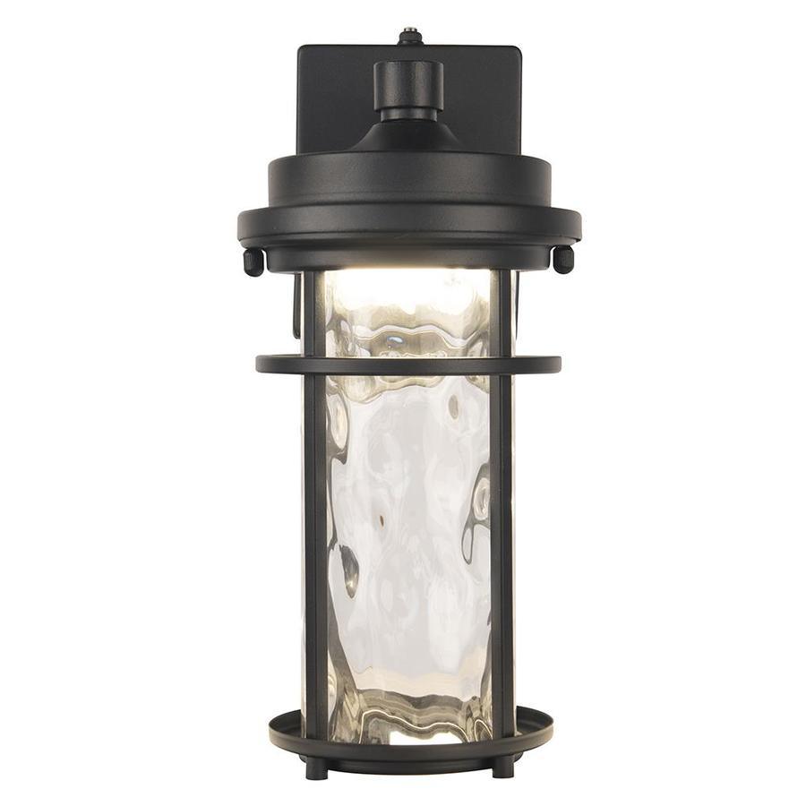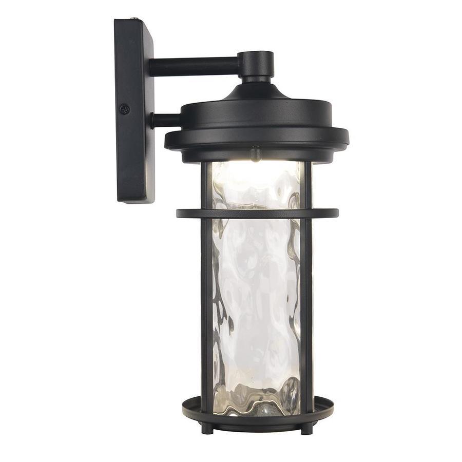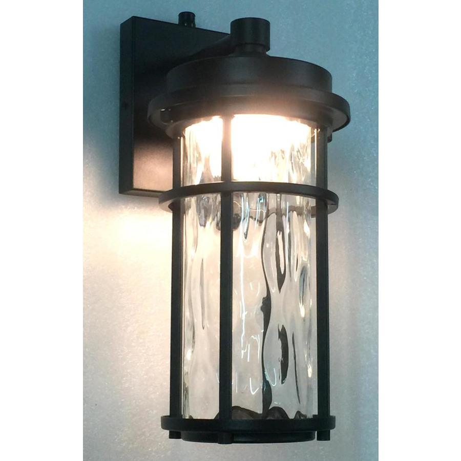 Black finish LED wall light is perfect for adding beauty and security to your outdoor space Features clear rain glass for beautiful texture and diffused light Lumens 600, color temperature 3000K, and 90 CRI Crafted with quality weather resistant materials for long lasting beauty and durability Transitional style lighting is perfect for lighting your entryway, porch or patio 15 watt integrated LED is long lasting and maintenance free Features dusk to dawn feature, lights come on automatically at dusk, and turn off again at dawn Measures 13.5 H x 6.4 W x 7.8 D Includes easy to follow instructions and hardware for fast and easy installation