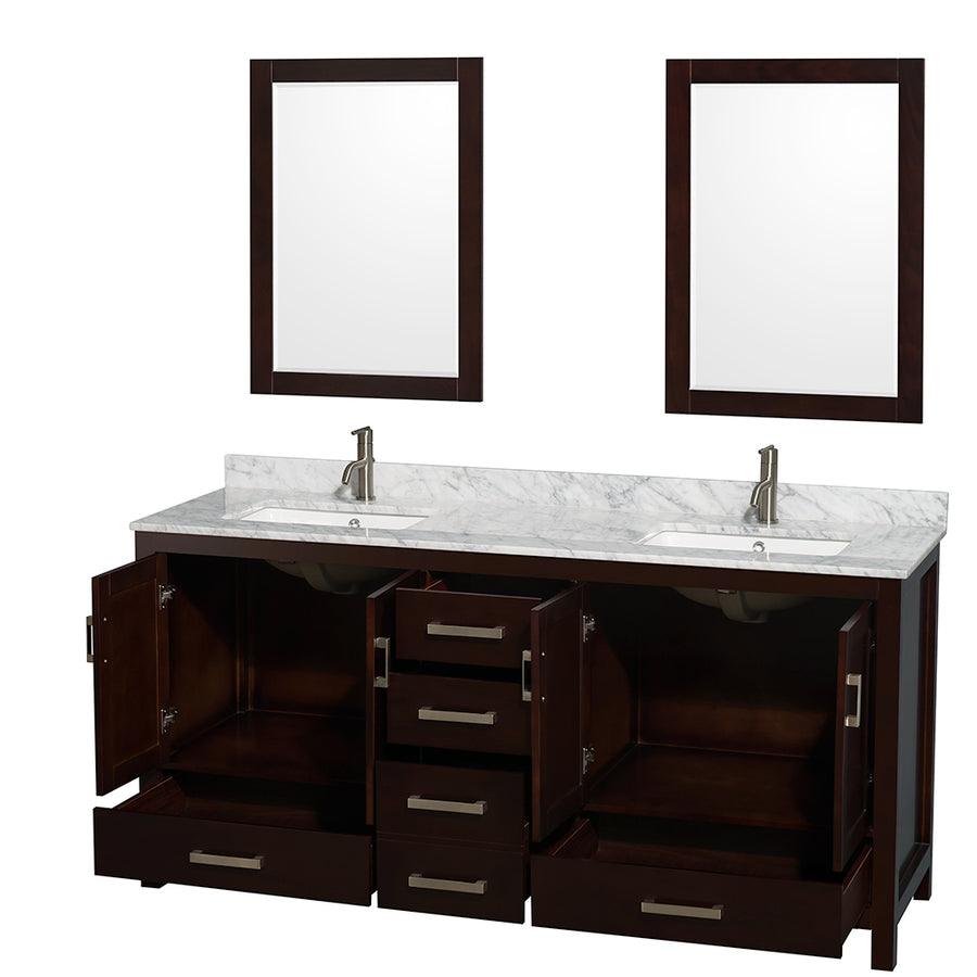 Wyndham Collection Sheffield 72-in Espresso Double Sink Bathroom Vanity with White Carrara Marble Natural Marble Top (Mirror Included)