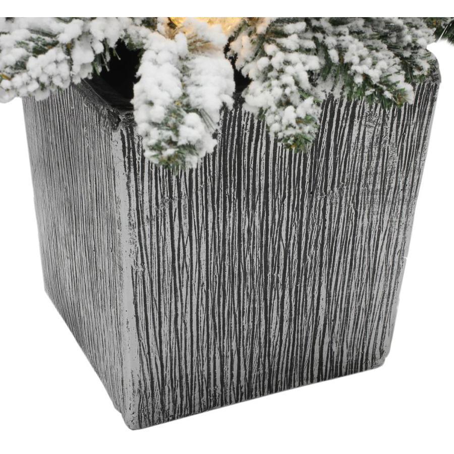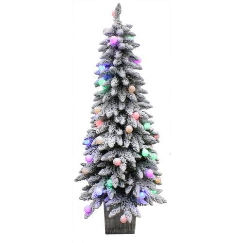5-Ft pre-lit artificial flocked pine Christmas tree makes it easy to enhance your holiday decor 50 Multicolored LED Globe lights give the tree a glowing touch 379 Branch tips create a very nice and full looking Christmas tree Out-swept 28-in diameter is perfect for outside your front door or in small spaces inside the home White washed decorative base adds elegance For indoor or outdoor (under-cover) use for versatility Stores easily for annual use