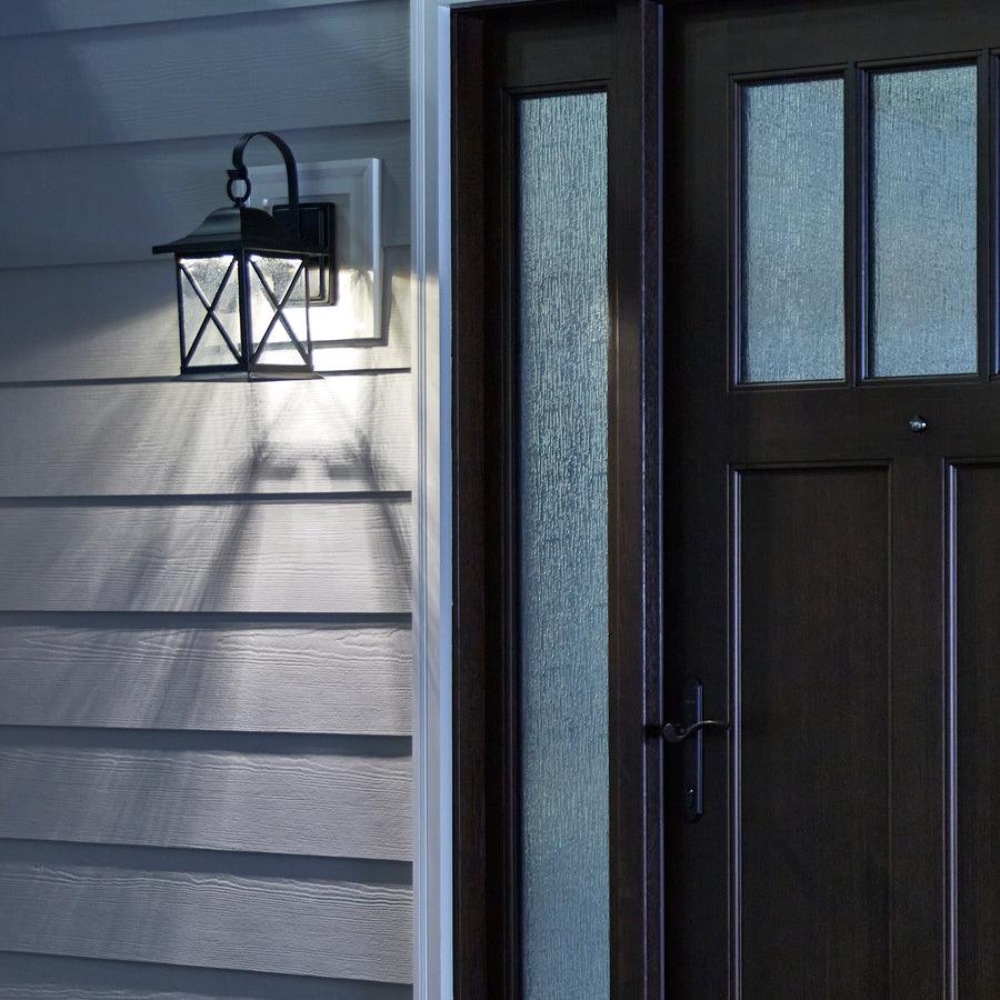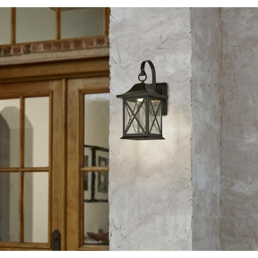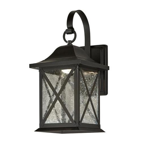 Metal outdoor wall light in black finish Clear seeded glass Integrated LED uses less energy and lasts longer All necessary hardware is included for installation 9 Watt LED creates great visibility for space 7-in W x 14.9-in H x 8.9-in D 3 year warranty on fixture and finish Wet location rated