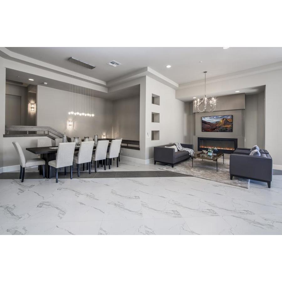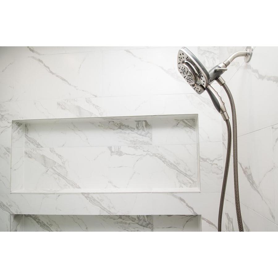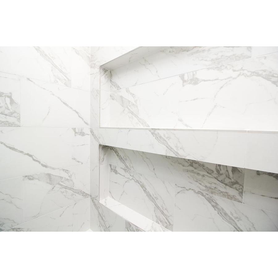 The classic beauty of honed Italian calacatta marble finds new form on highly durable porcelain tile