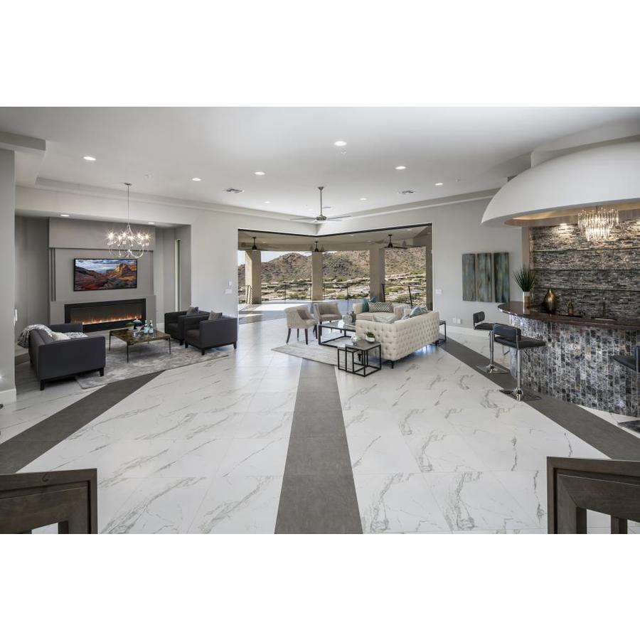 Large-scale veining emulates the elegant look of marble in white and gray tones