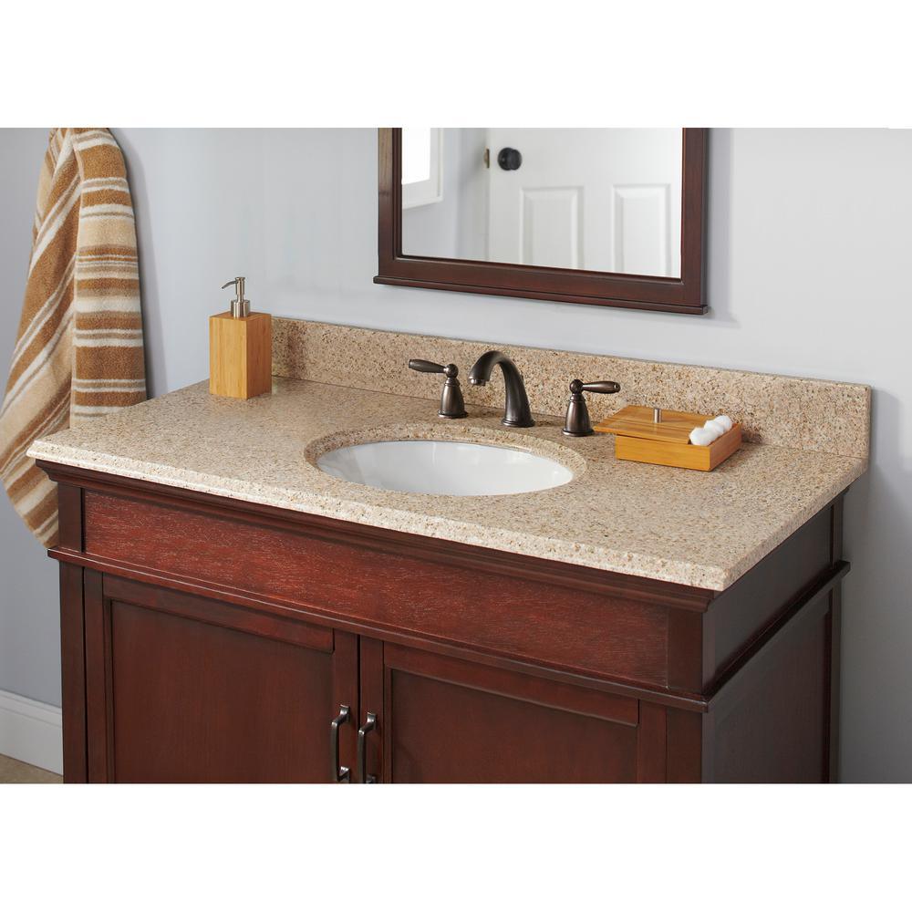 Bring the long-lasting beauty of granite to your bathroom with the Pegasus Granite Vanity Top in Beige. Beveled edges are carved around the front and the bowl cutout to create an elegant appearance, while the included vitreous China bowl completes your look. Installation is easy thanks to the top's pre-drilled faucet accommodations and included 4 in. high backsplash designed to protect your wall from water damage. This natural granite vanity top is factory polished to create a smooth, glossy surface that resists cracking, discoloring and chipping, so you can count on durability and top-quality appearance for years to come.