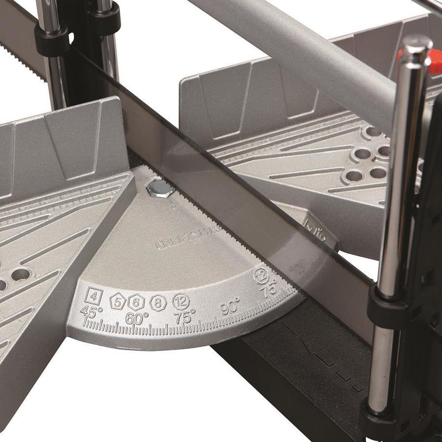 One touch angle adjustment for quick and easy angle change Quick cam clamp holds work for accuracy, and work stop repetitive cuts 11 preset angle stops Induction hardened teeth for long lasting sharpness