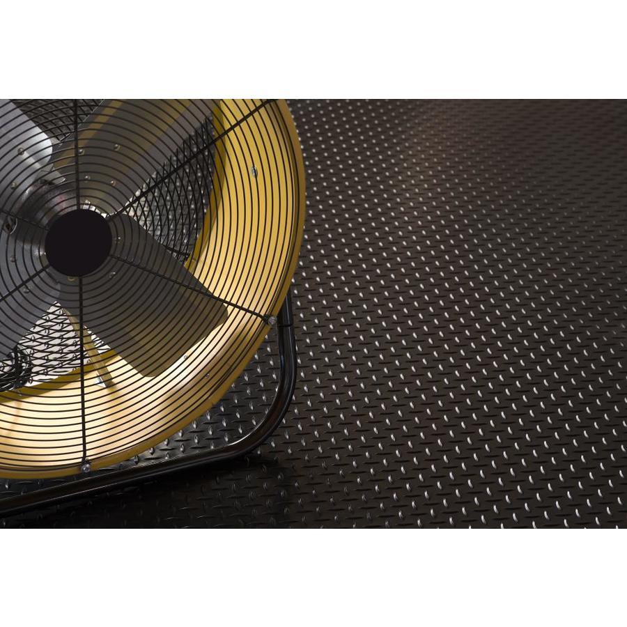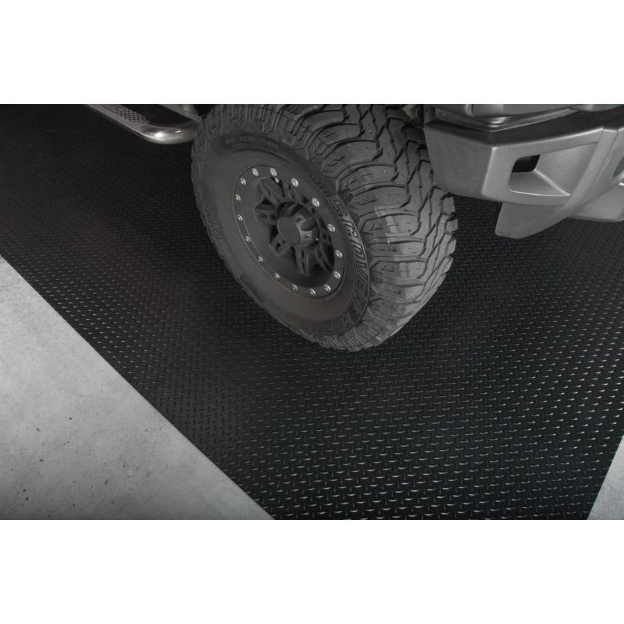 G-Floor Midnight Black Diamond Tread offers traction and a rugged appearance 100% Polyvinyl all the way through, no layers or fillers to break down and cause deterioration, plus strong traction for slip resistance Waterproof protection keep liquids on the surface allowing for easy cleanup Floor Score certified ensuring the flooring is safe for indoor use perfect for a garage, basement, office gym, kitchen, bathroom or man cave Simply clean with a damp mop or for a deeper cleaning use a de-greasing vinyl floor cleaner as directed Easy to cut and trim for a custom fit using just a utility knife Measures 0.075-in base thickness and 0.13-in overall thickness and 7-1/2-ft wide x 17-ft long to cover 127-1/2-sq-ft - a great size for a single vehicle parking pad Can be installed over concrete or wood sub-floors, with or without adhesive to help prevent concrete deterioration and hides cracks and stains Backed by a limited lifetime warranty