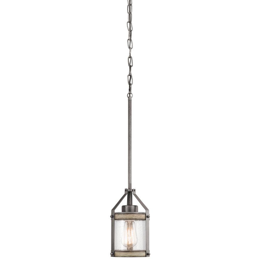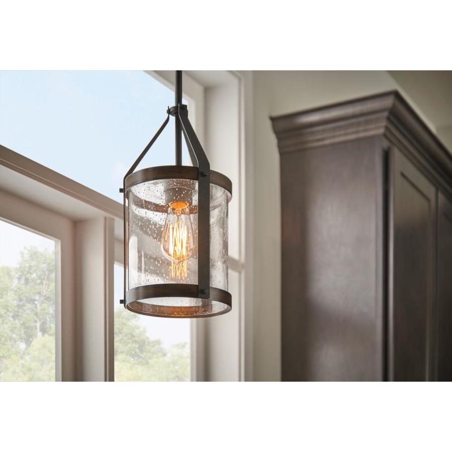 This distressed black and wood tone finish mini pendant is part of the Barrington collection The clear seeded glass shade allows for maximum illumination Includes one 60-watt medium base starter bulb Fixture dimensions: 8.13-in W x 8.13-in D x 14-in H ETL certification shows that this fixture has met the minimum safety standards of a widely recognized testing organization All mounting hardware and complete instructions are included for an easy installation