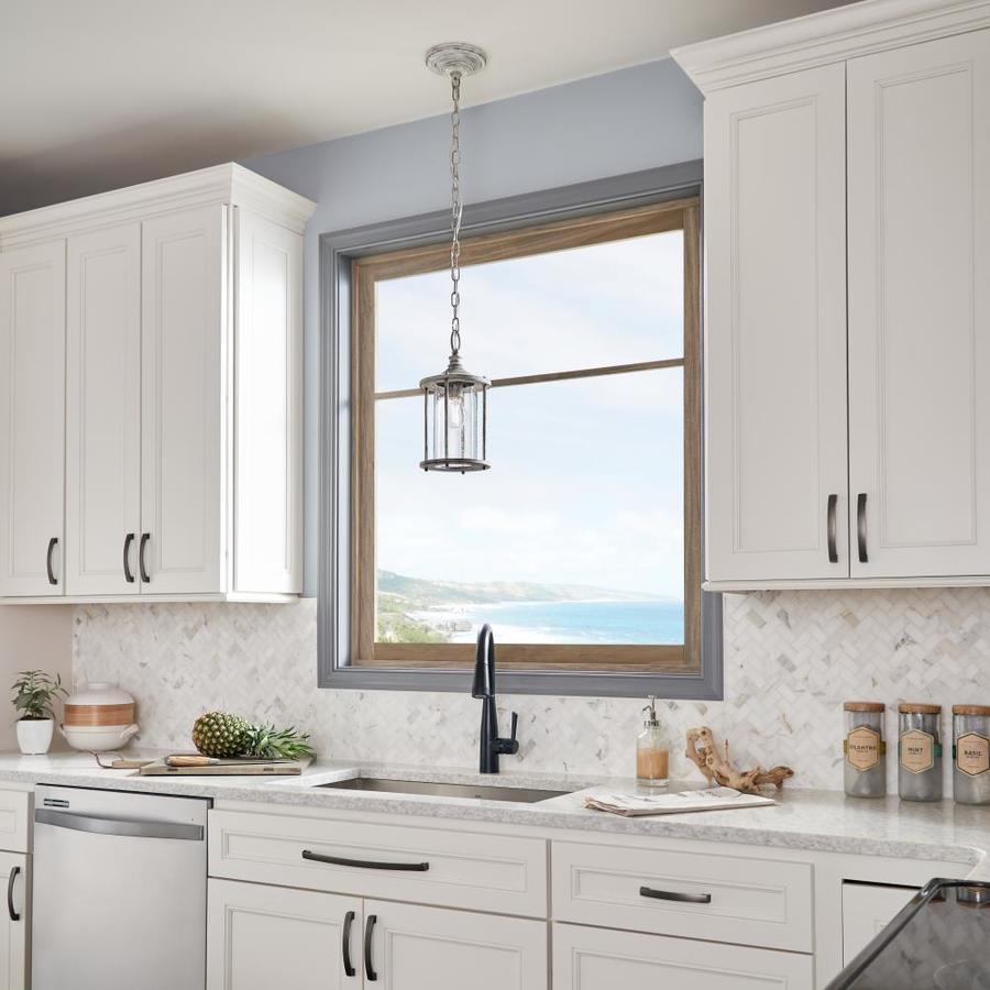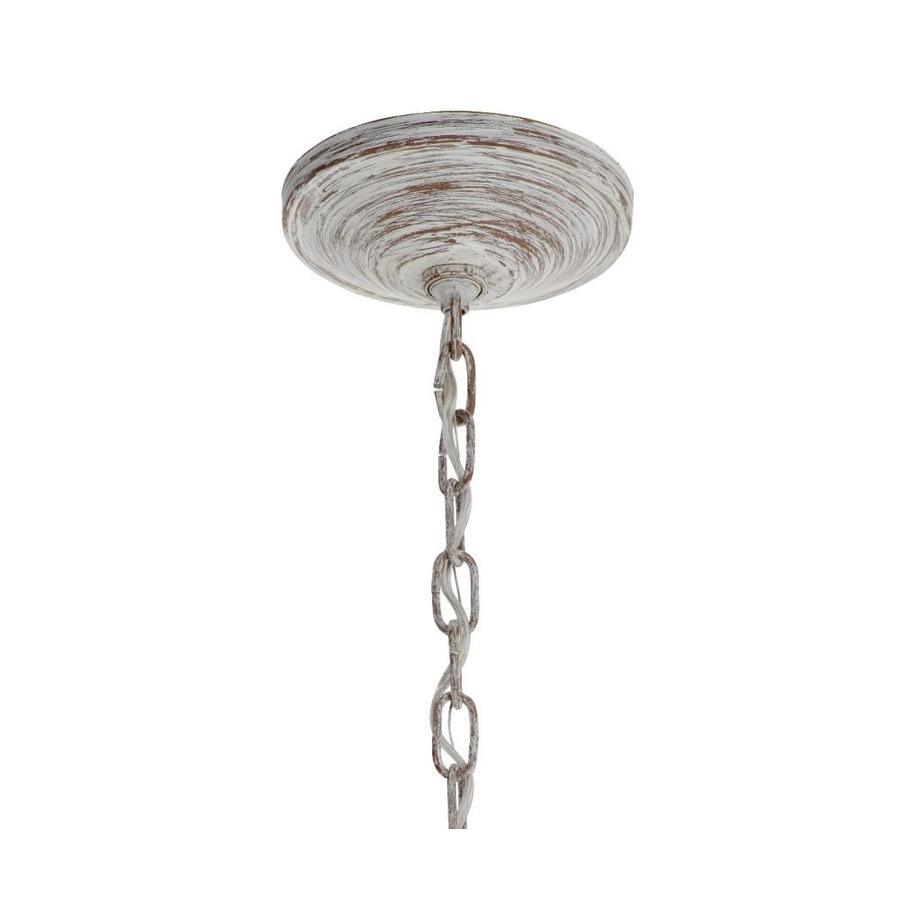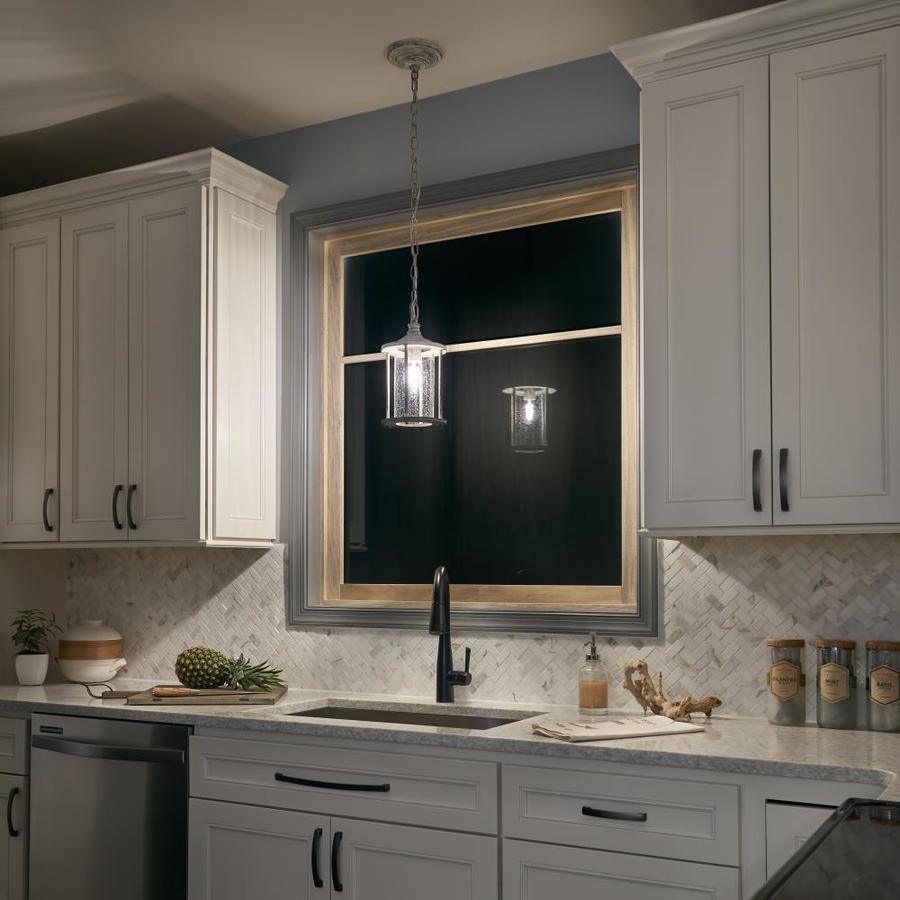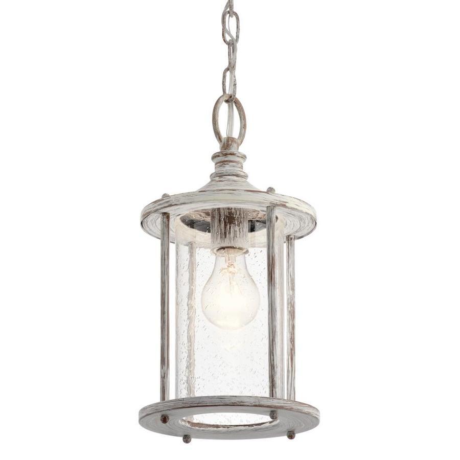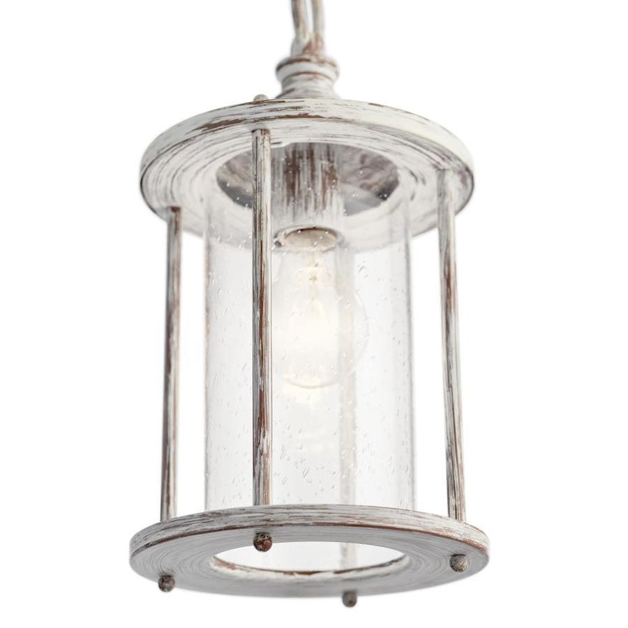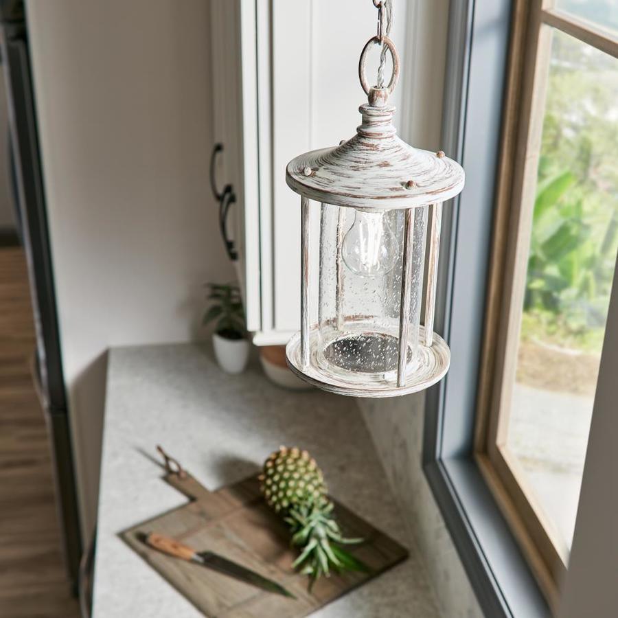 The Distressed Antique White lantern style mini pendant has a unique style This fixture features clear seeded glass panels for a classic touch Requires one 60 watt medium base bulb (sold separately) Fixture dimensions: 13.75-in H x 7-in diameter All mounting hardware and detailed instructions are included for an easy installation ETL certification indicates that this fixture has met the minimum safety standards of a widely recognized testing organization Coordinate with other fixtures from the Hawser collection for a dramatic look