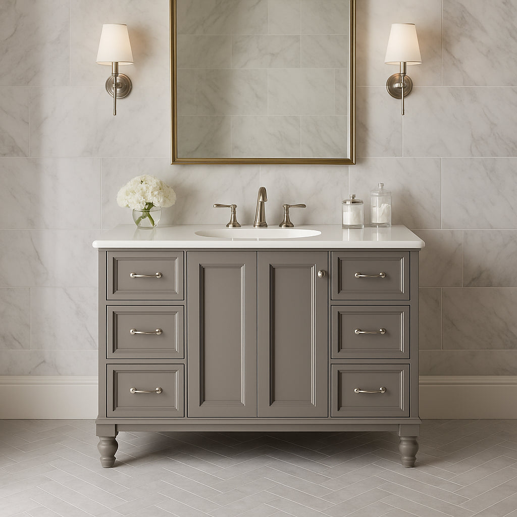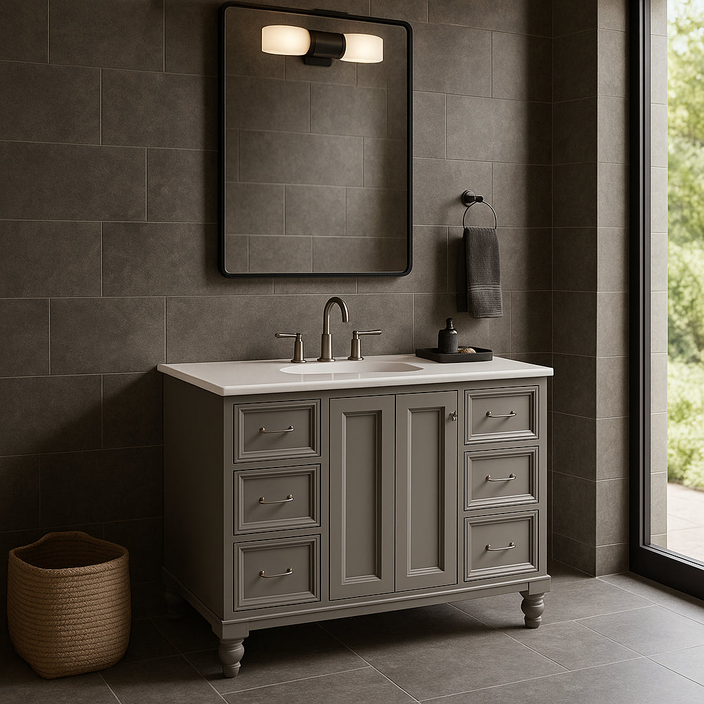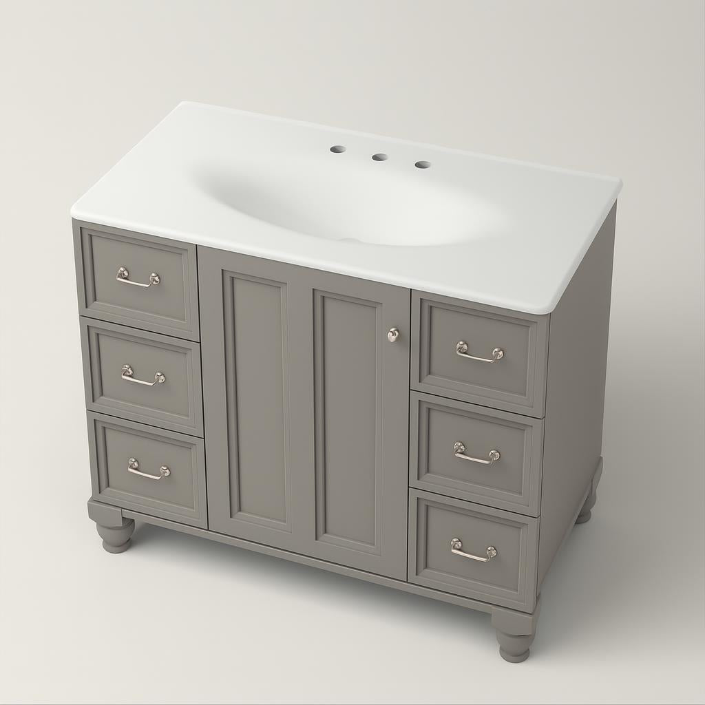The Kohler Damask 42-inch bathroom vanity cabinet in Mohair Grey offers a modern and elegant solution for bathroom storage. Featuring six drawers and one door with soft-close functionality, this freestanding vanity combines style and practicality.
