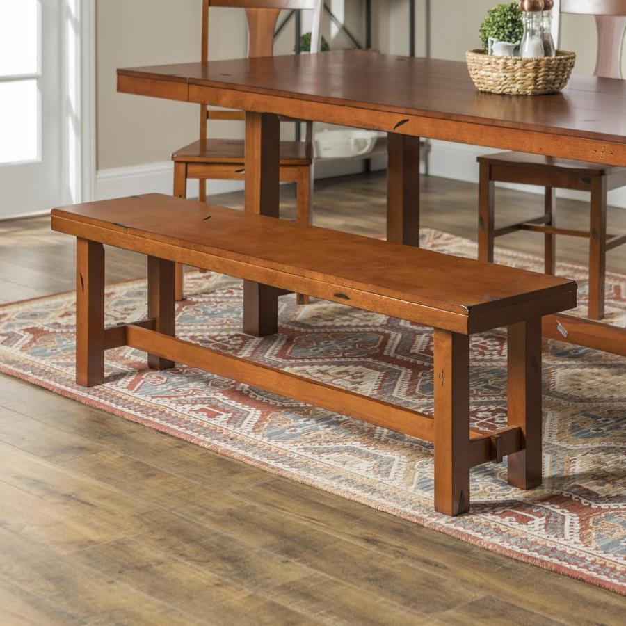 In a stylish, transitional and rustic farmhouse style in a contemporary design Made with solid wood veneer atop warp-resistant MDF The purposeful distressing creates a warm, rustic feel In a rich, dark oak finish Ideal in your entryway, dining room, or kitchen for extra seating Ships ready-to-assemble with step-by-step instructions